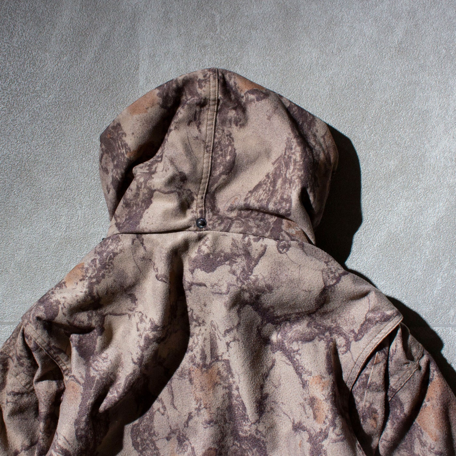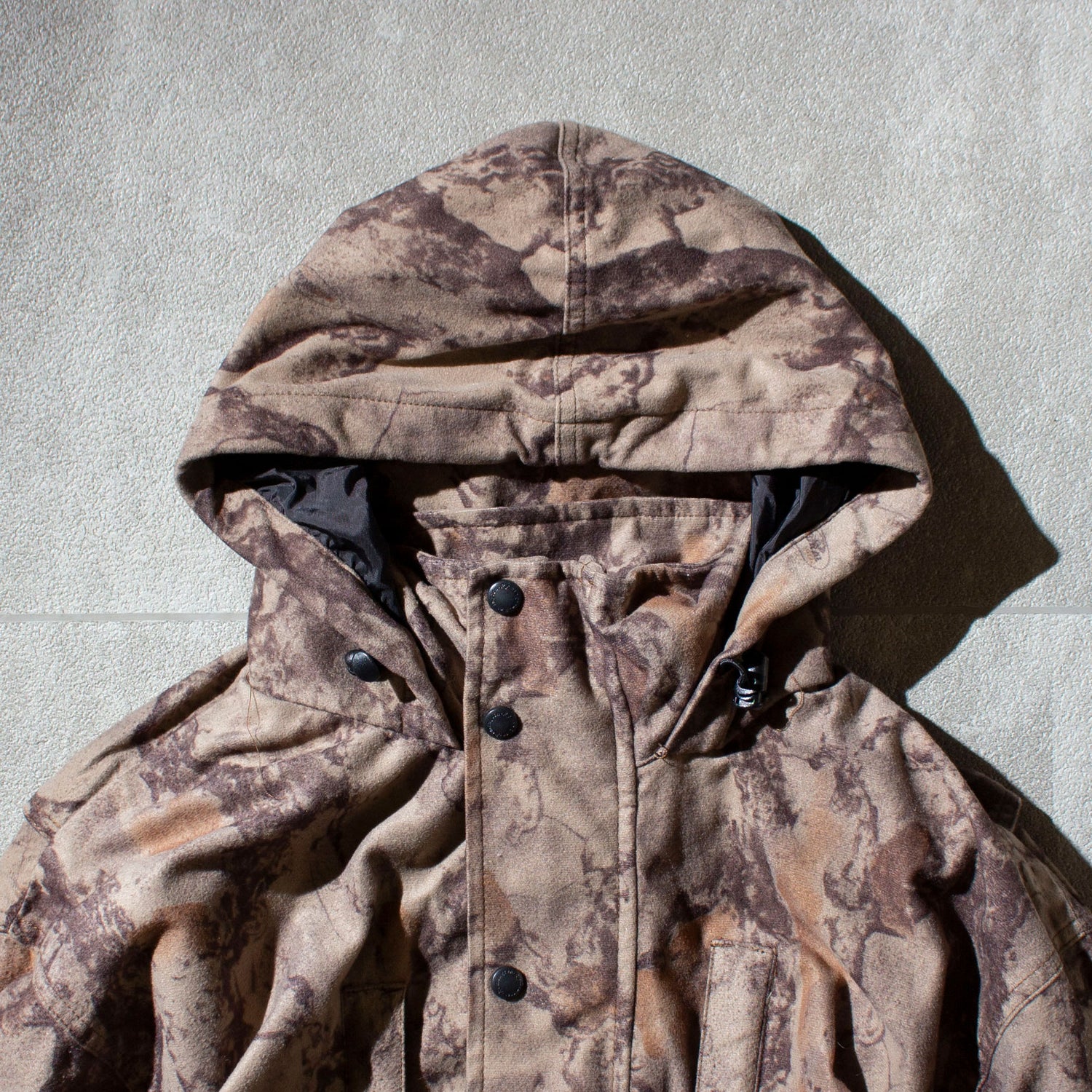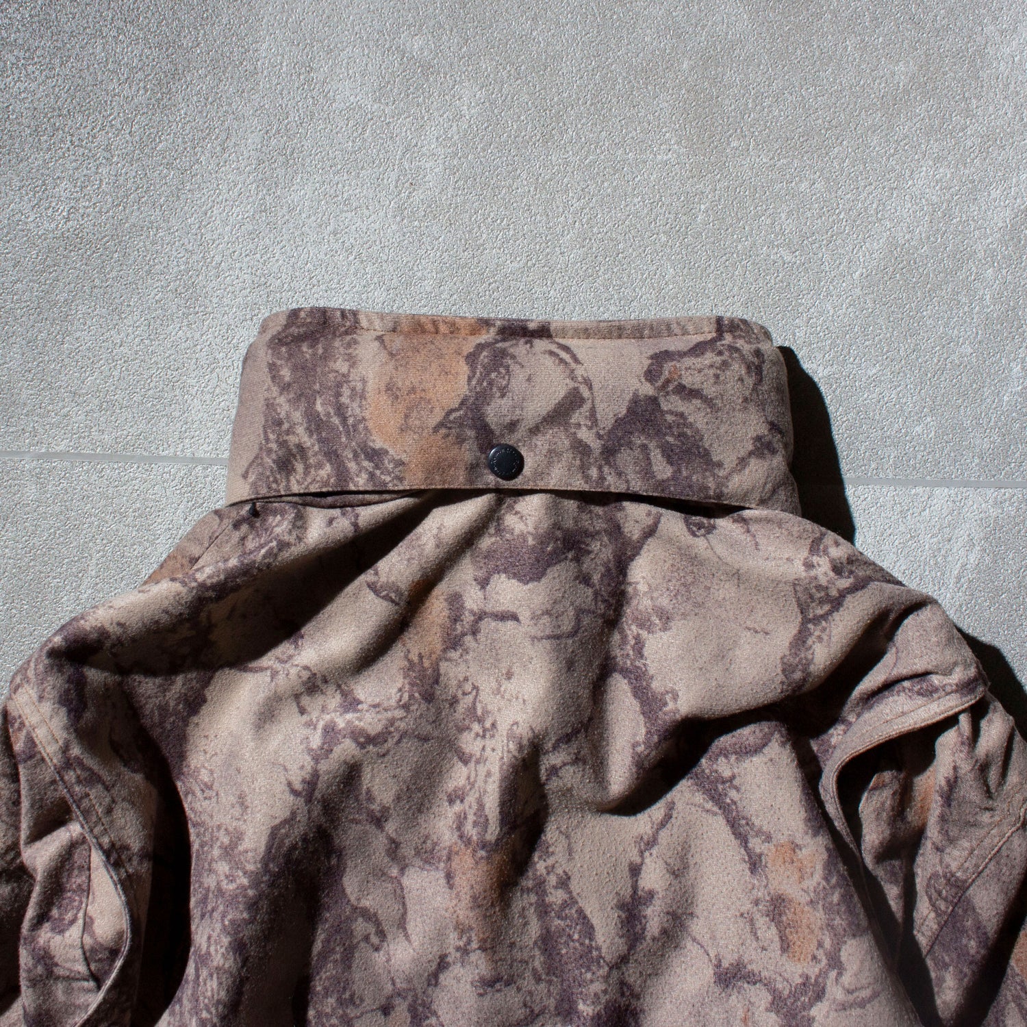 ・NATURAL GEAR tree camo fabric・Brushed polyester material・Back action pleats・Roomy overfitting・Short length that's not too short・Hood can be stored away・2 hand warmer pockets, 2 flap pockets,