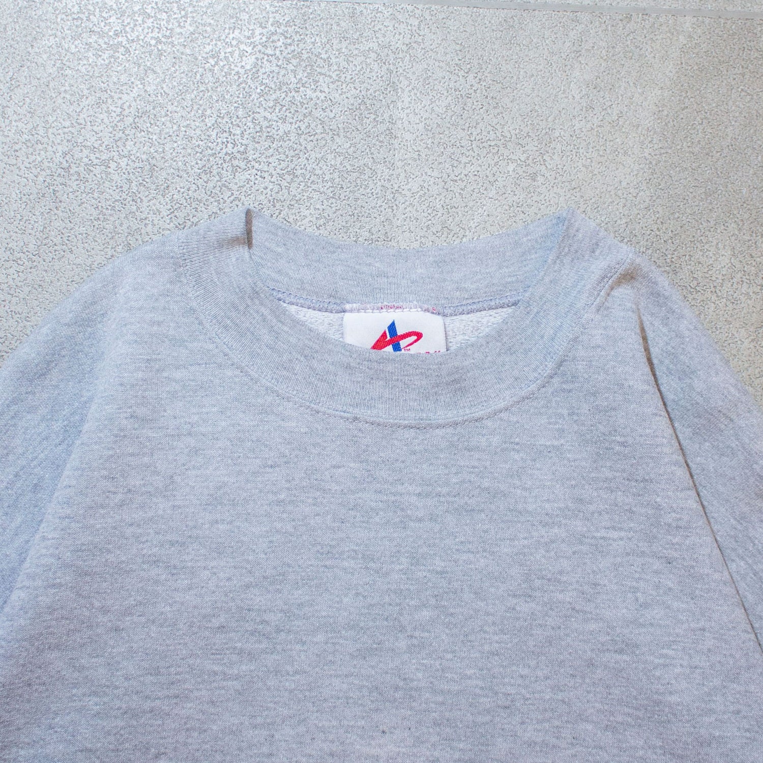 176cm / がっちり体型のスタッフが着用。身幅・肩幅ともにゆとりのあるサイズ感で、アームホールはやや太め。裾リブが緩く効いているので着用すると着丈が上がり自然な短丈で着用できます。素材表記消えてますが恐らくポリエステル×コットンのスウェット生地。薄手の裏起毛生地で、軽くさらっとした着心地です。