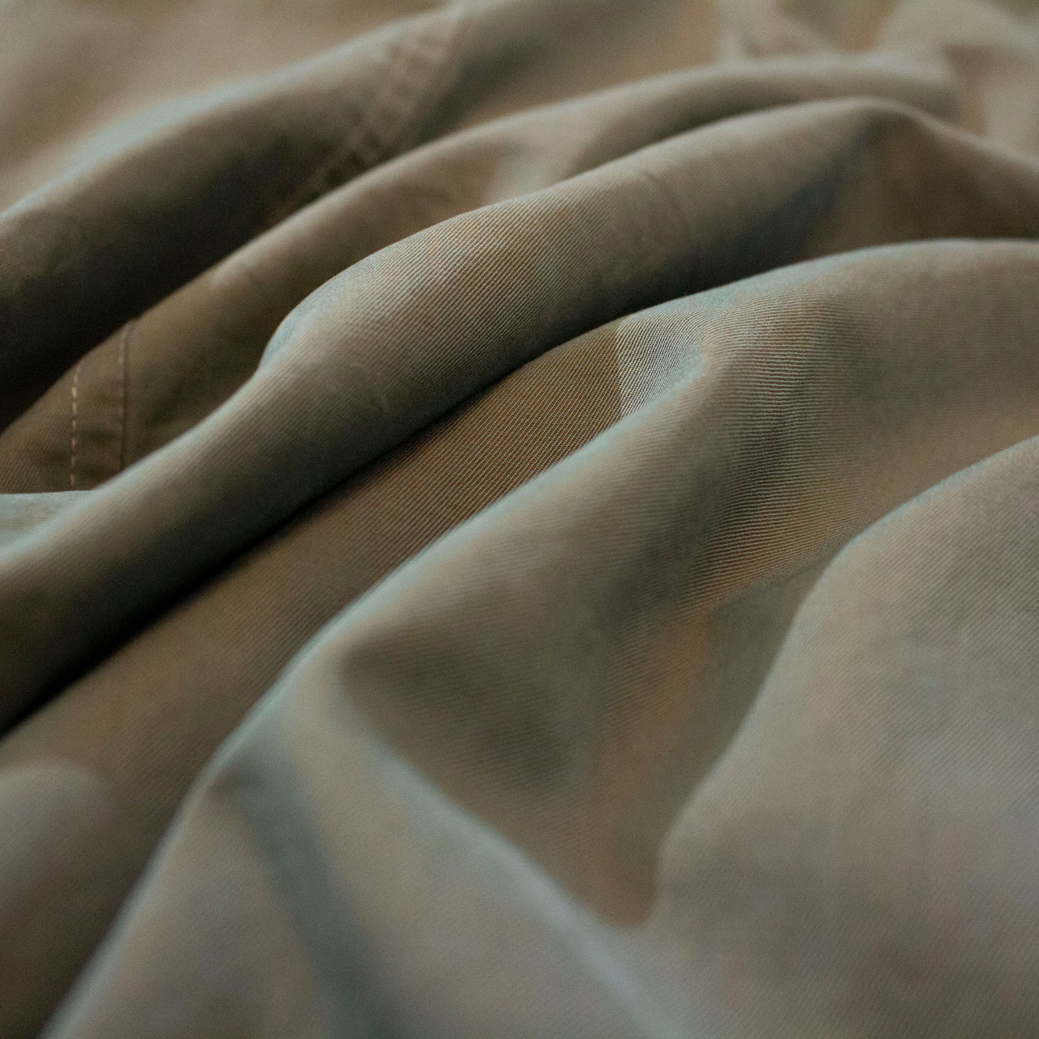 コットン100%の中でも貴重な玉虫生地は光の反射や見る角度によって色味の変わる不思議な生地感、洗いこまれた雰囲気も最高です。超高密度で織られているので風を通しづらく、インナーにフリースやニットなど着こめば真冬でも暖かく着用できます。ライニングはペンドルトンのシャツにあるようなウールライニングなので冬の着用前提の作りです。肩のラインが綺麗に出ることから一枚袖が高騰しておりますが、こちらのコートのショルダーラインはかなり綺麗な部類に入るかと思います。