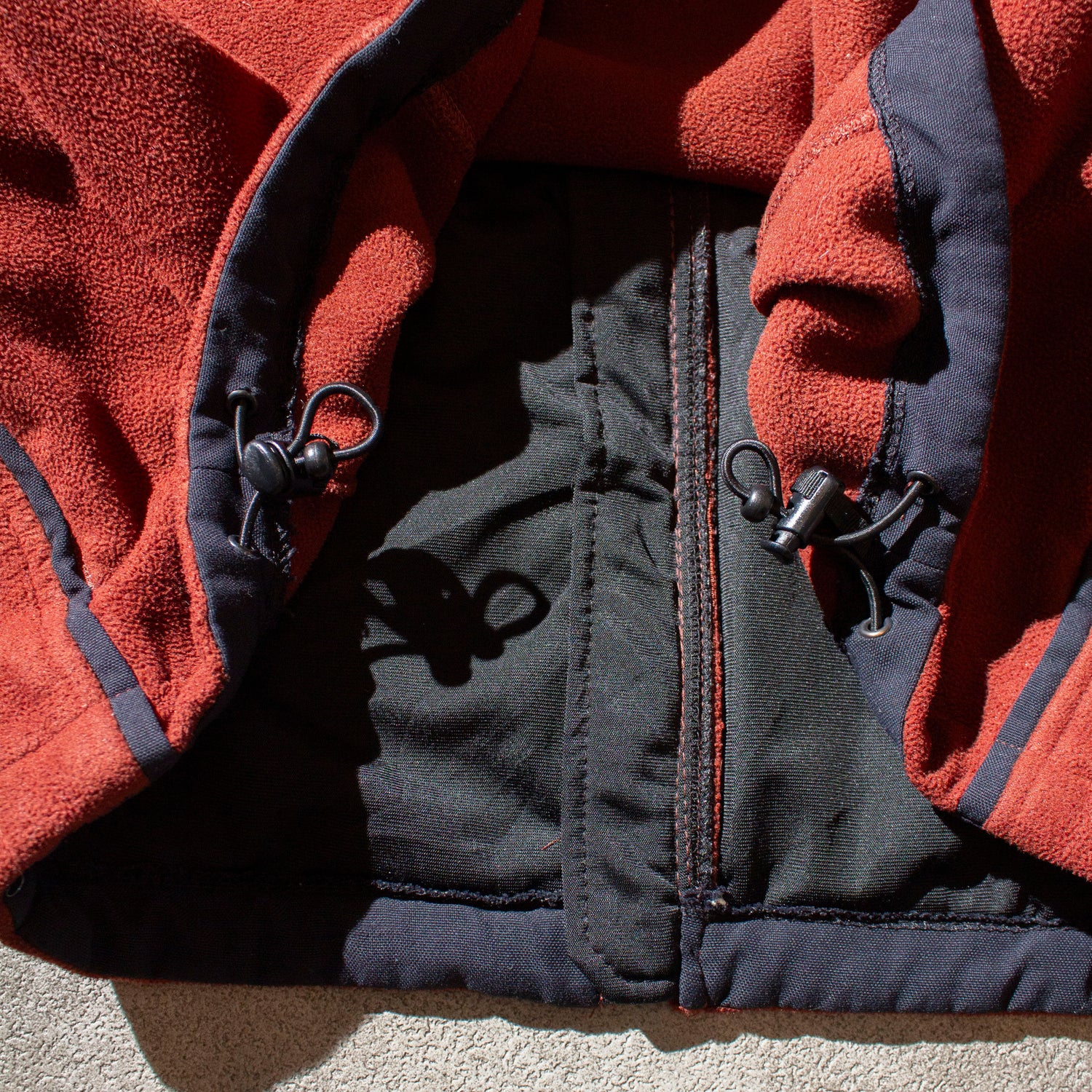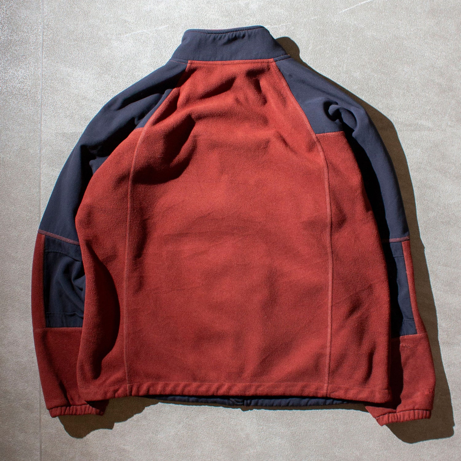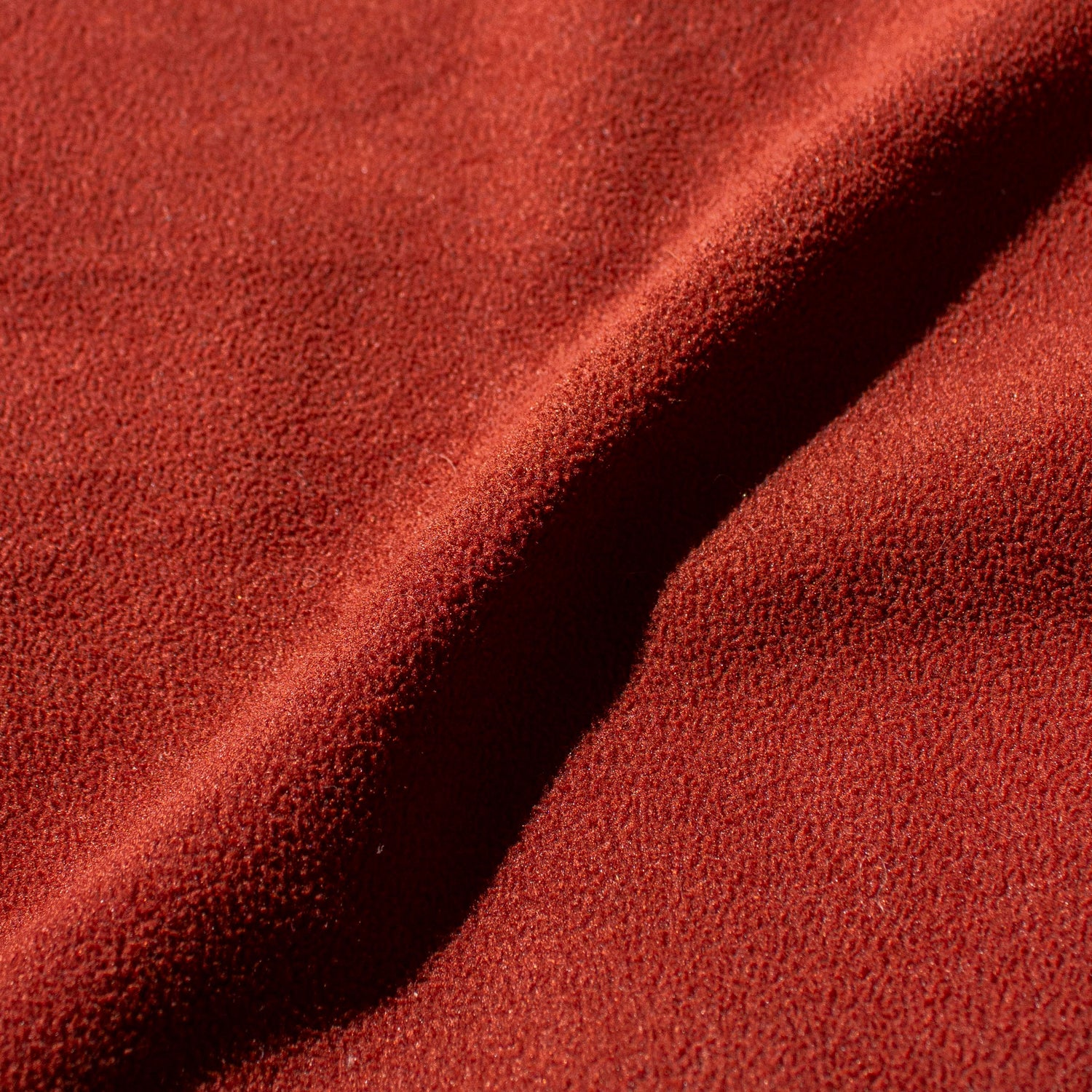 通常のフリースは通気性が高く、どちらかといえばインナー使いが多いですが、こちらは防風性に優れた“Wind Shear”素材を採用しているため、アウターとしても抜群の暖かさを誇ります。通常のフリースよりも密度が高く、裏地に防風フィルムを挟み込むことで冷たい風をしっかりシャットアウト。軽さと保温性を両立した実用的な一枚です。シルエットはゆったりめで、肩もドロップ気味。身幅にも余裕があり、スウェットなどを中に着込んでもストレスなく着用できます。