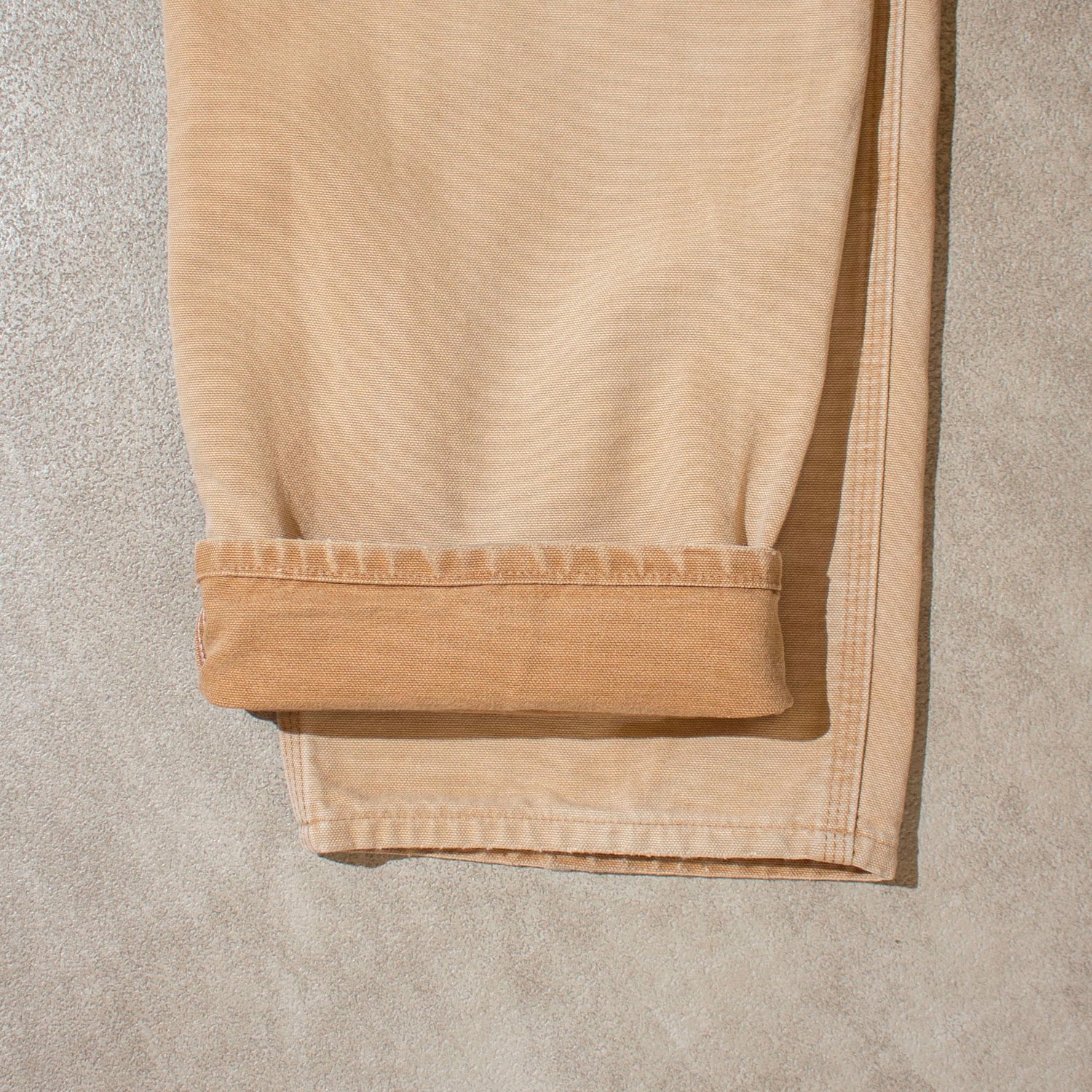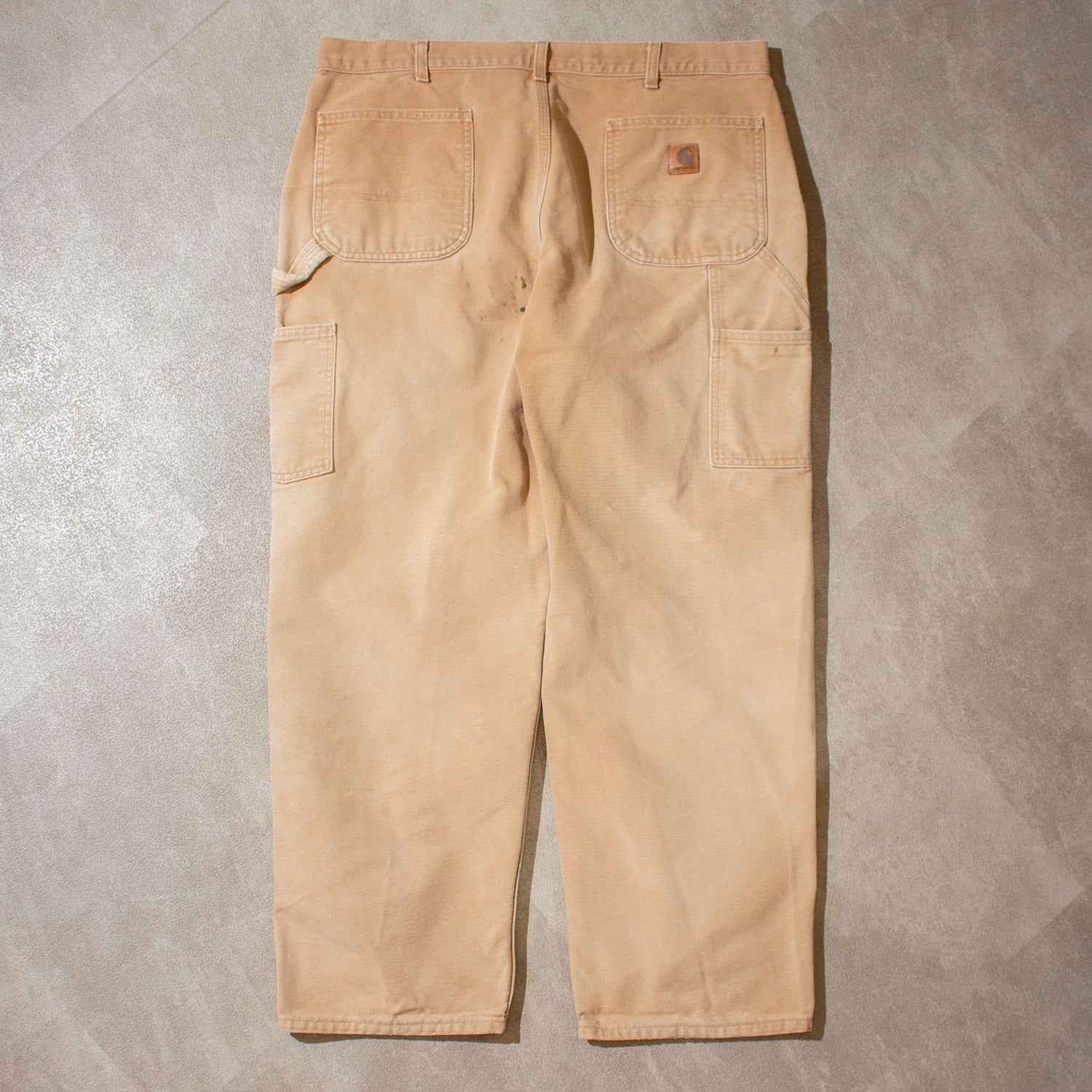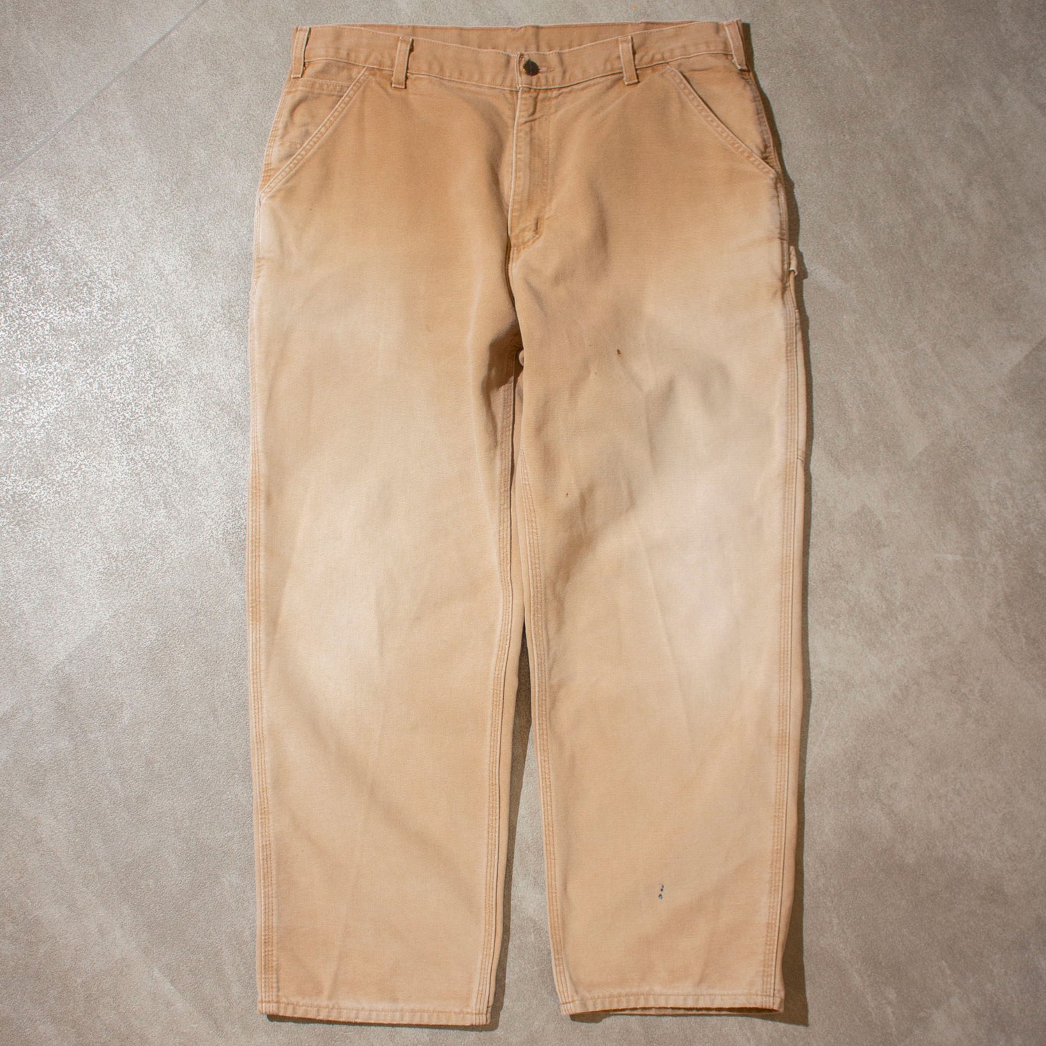 Carhartt の定番ペインターパンツ。W38 の大きめサイズをベルトでギュッと絞って穿くことで、極太シルエットをしっかり楽しめる1本です。ペインターパンツらしい無駄のないストレートシルエットで、スニーカーから革靴まで幅広く相性良し。白っぽくフェードしたベージュカラーが雰囲気抜群で、リアルに飛んだペンキ跡も加工では出せない良い味になっています。キレイめアウターの“ハズし”としても、無骨なアウターと合わせてもサマになる万能パンツ。1本あるとつい手が伸びてしまう間違いない定番パンツです。