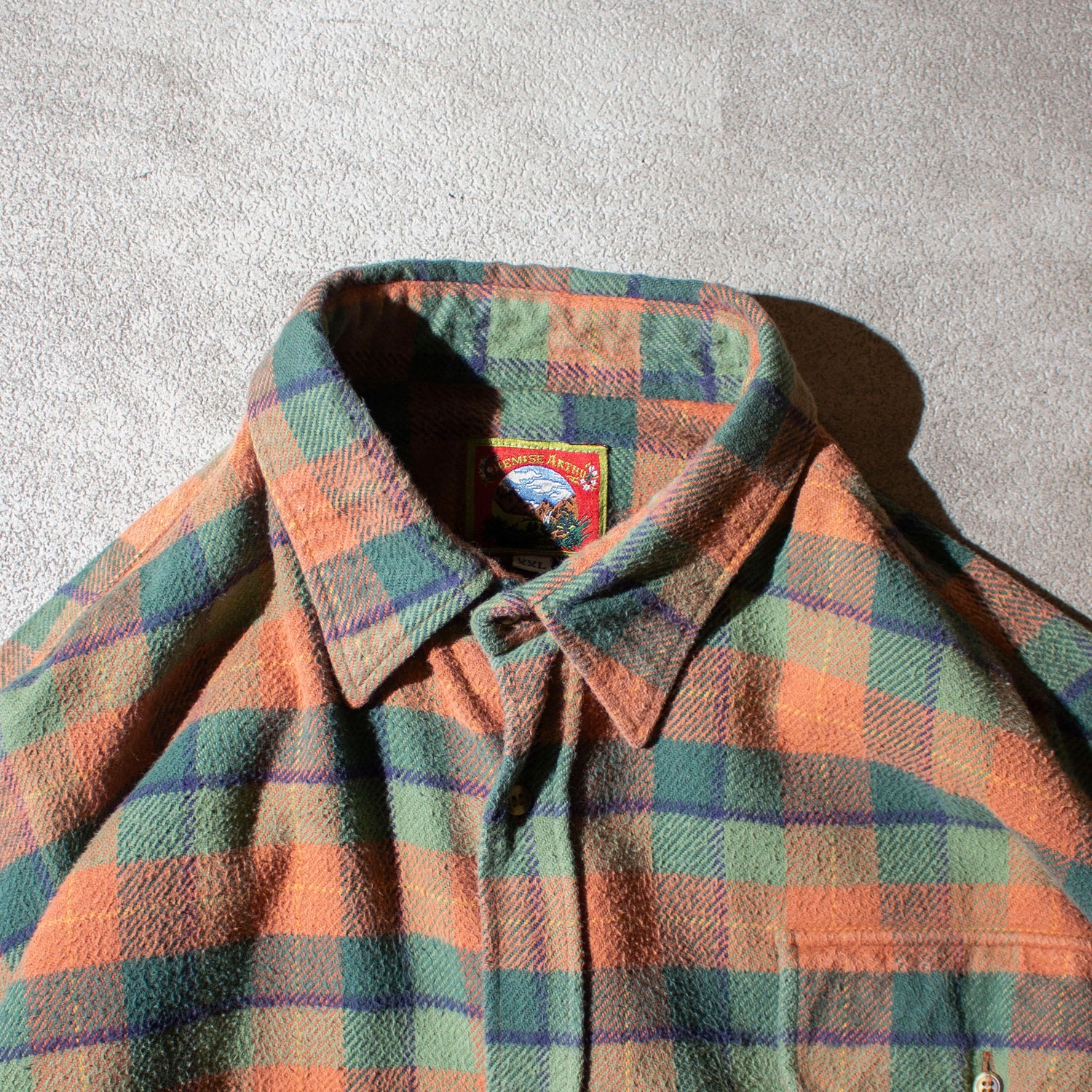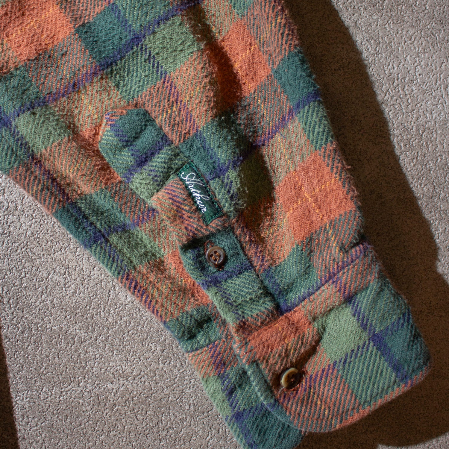 こちらはやや厚手で毛羽感のあるフランネル生地を使用した1着。アメリカ古着ではあまり見られないグリーン×オレンジベースの上品な配色が印象的です。広めの身幅と肩幅に対して着丈はやや短めで、バランスの良いボックスシルエット。胸ポケットの位置が少し高めに設定されており、程よく力の抜けた雰囲気です。