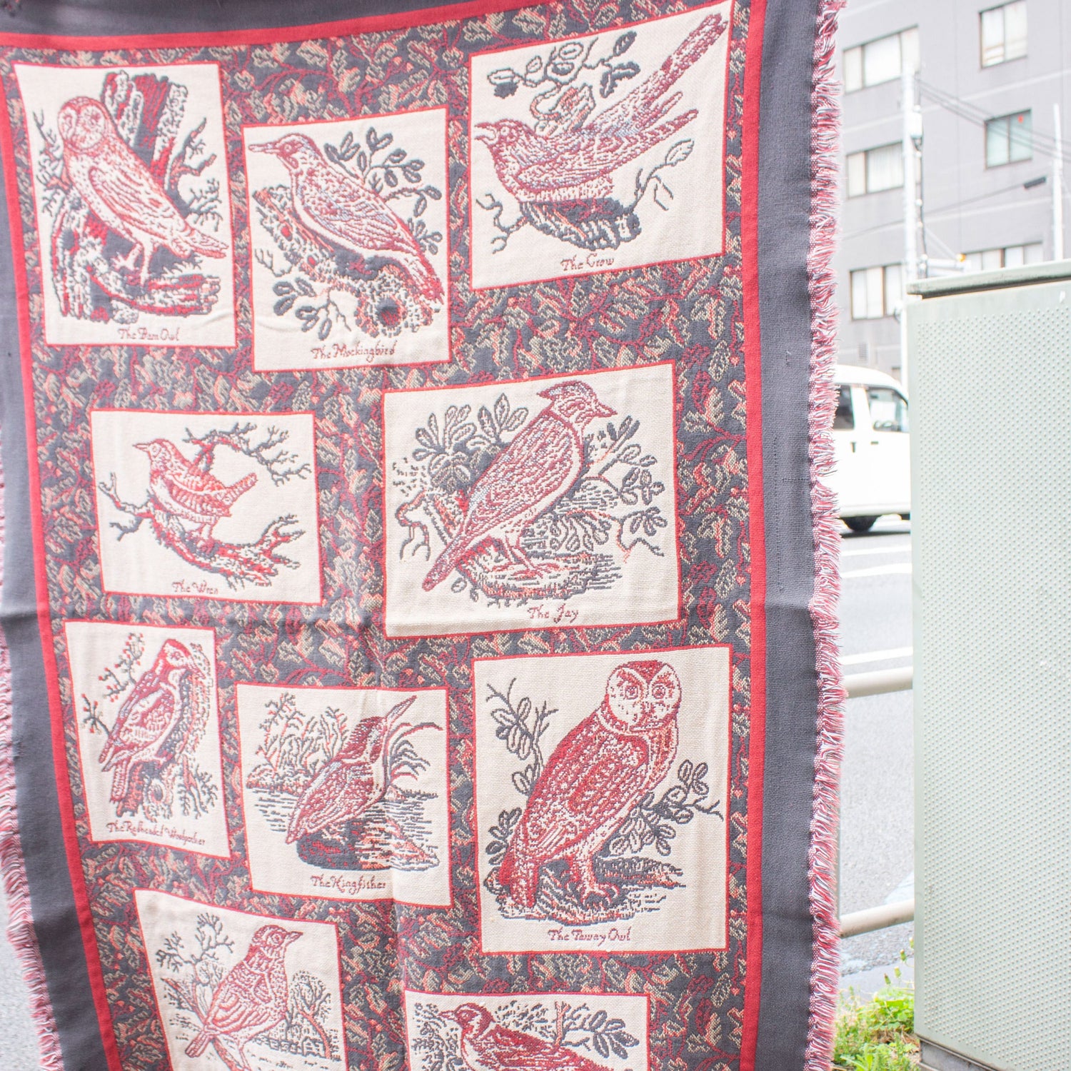鳥の図鑑のような構成でデザインされたコットンラグ。フクロウやカラス、カワセミなど複数の鳥をパネルごとに分けて配置した、クラシックな総柄。ブランケット感覚で使える肌触りのいいコットンラグです。