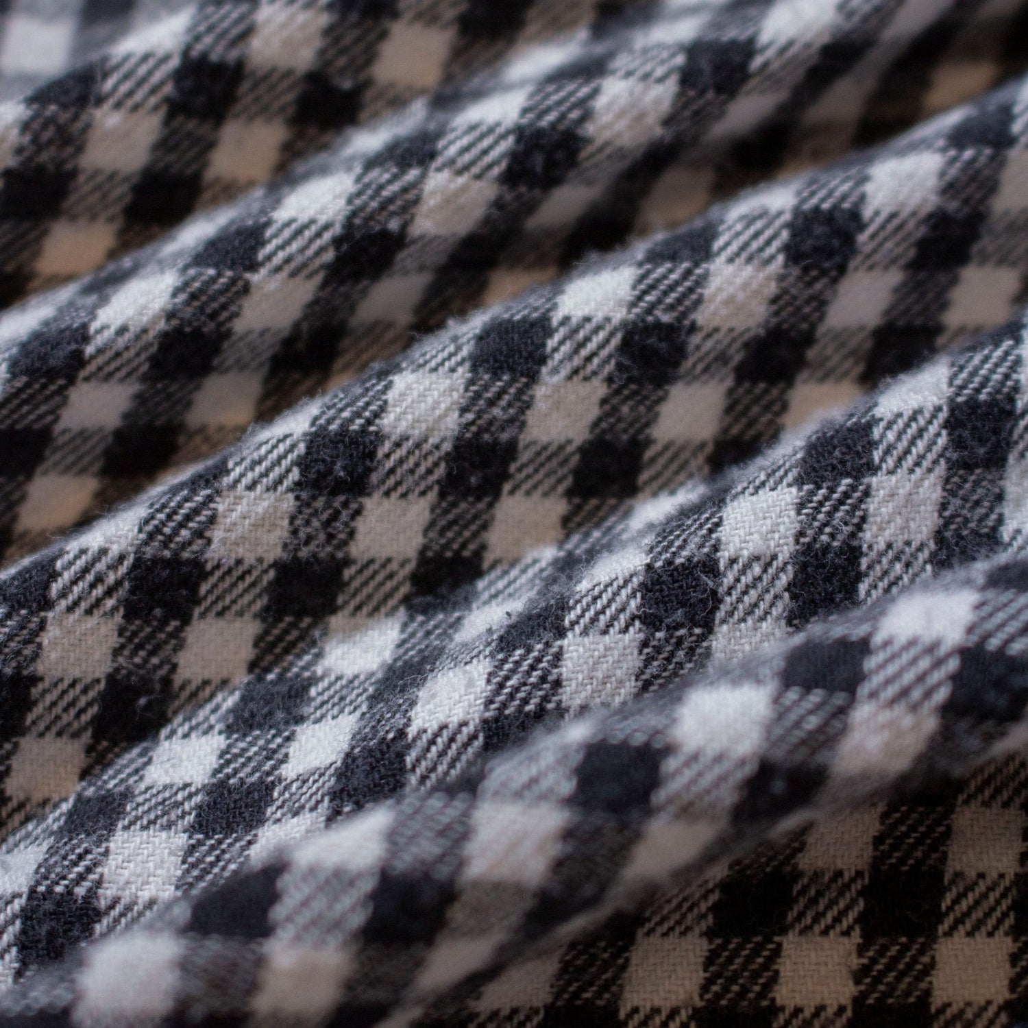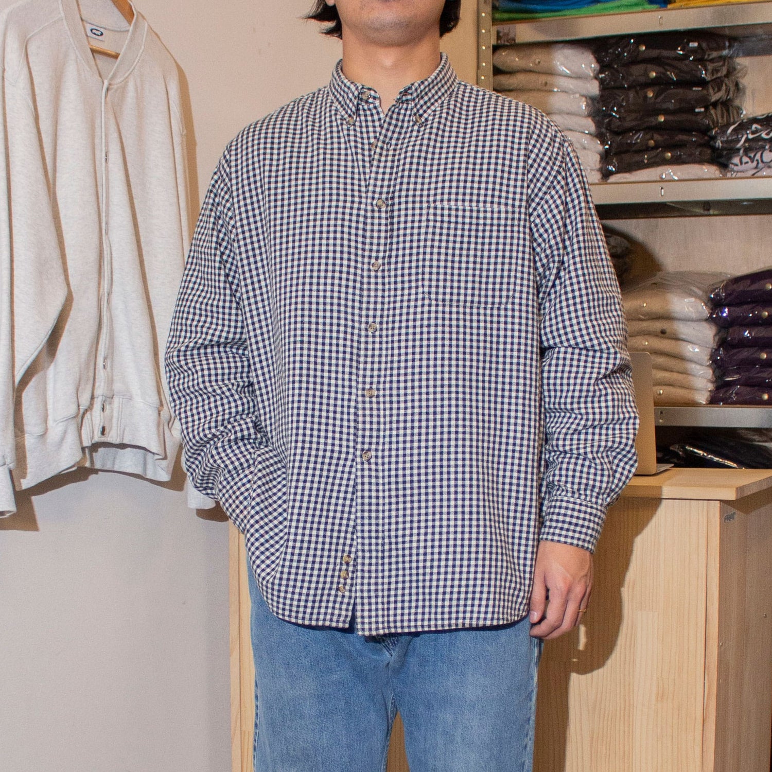 ギンガムチェック柄の薄手フランネルで、柄のバランスと生地感のどちらも申し分ない仕上がりです。サイズは身幅広めのXL表記ですが、着丈は長すぎず非常にバランスの良いシルエット。インナーにパーカーなどを合わせても余裕があります。太めのブルージーンズでラフに合わせても良く、スラックスでクリーンにまとめてもサマになる1着。