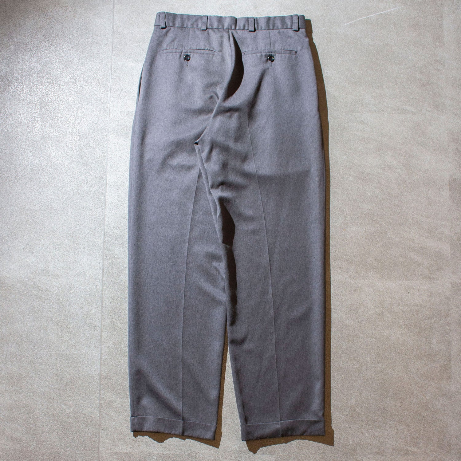 写真じゃ少し伝わりにくいですが、光沢ととろみのあるスラックス。ポリエステル100%なので穿き心地も良いです。品のあるアクションスラックスみたいなイメージが近いと思います。