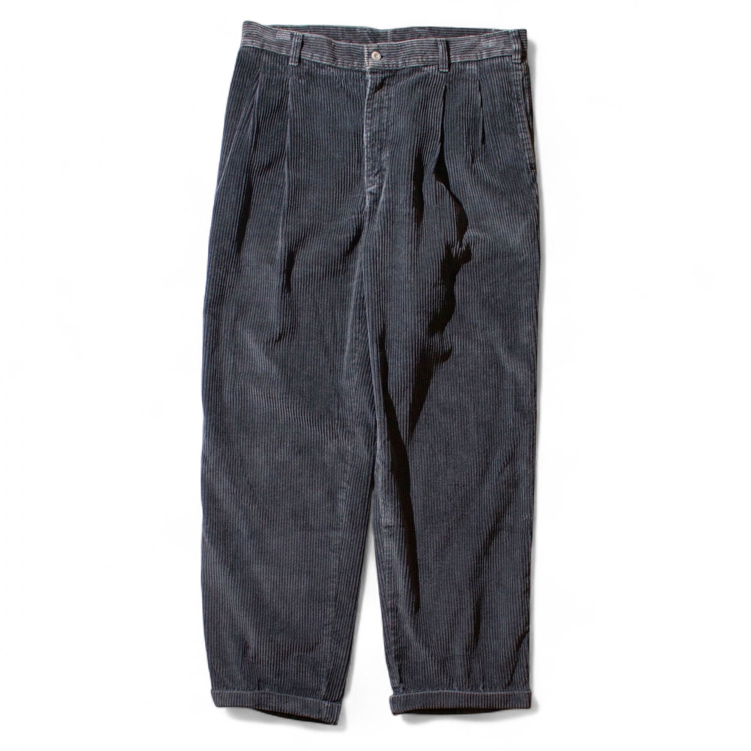 Dockersの太畝コーデュロイパンツ。色褪せたダークグレーのトーンが雰囲気抜群の1本です。しっかり太めのワタリから緩やかにテーパードするルーズシルエット。腰穿きで穿くと程よくルーズなワイドシルエットが楽しめます。