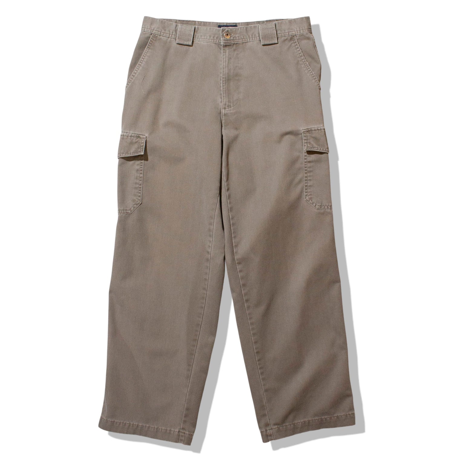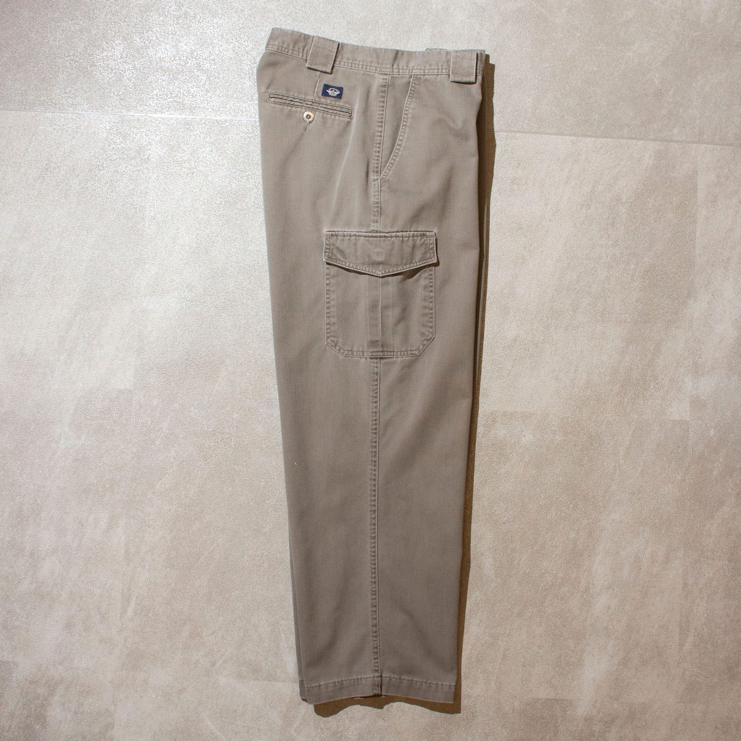 Dockersの9コットンカーゴパンツ。カラーは大人っぽいモカ系で、リタリー由来のカーゴでありながら落ち着いた印象の1本です。シルエットは太すぎず細すぎない、絶妙なバランスのストレート。いわゆる軍パンの無骨さというより、ドッカーズ定番のチノパンに後付けでカーゴポケットを配したような、非常にシンプルで洗練された作りです。