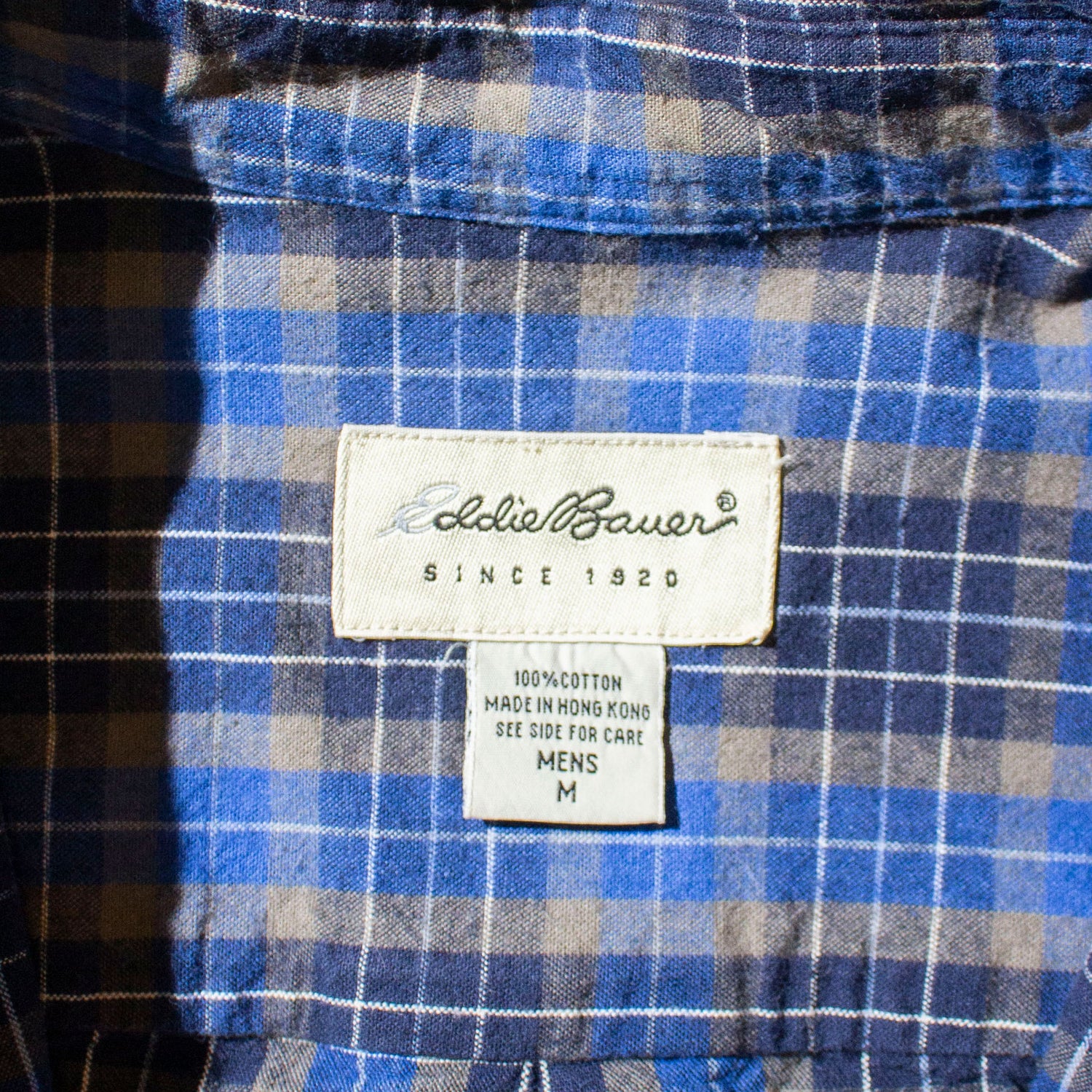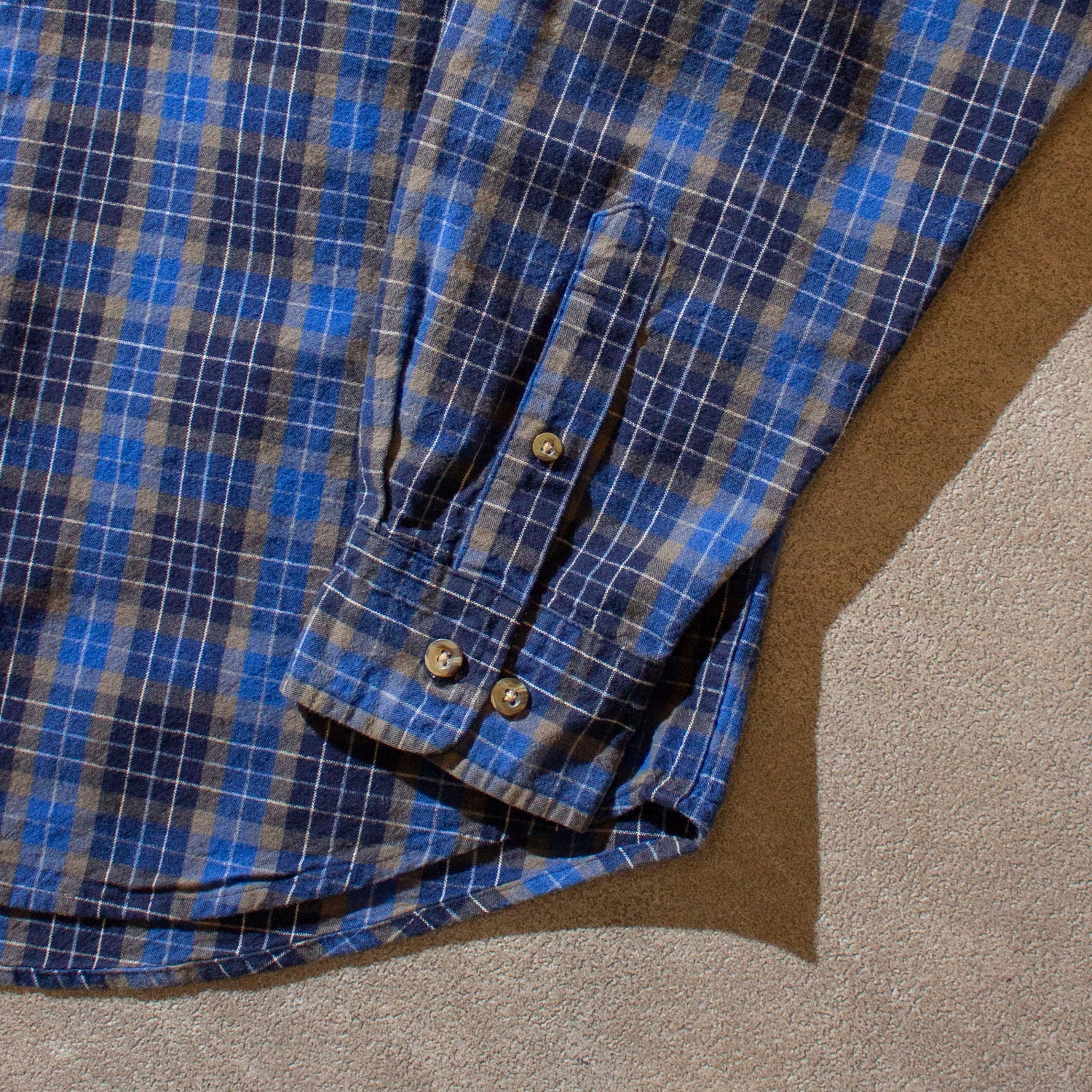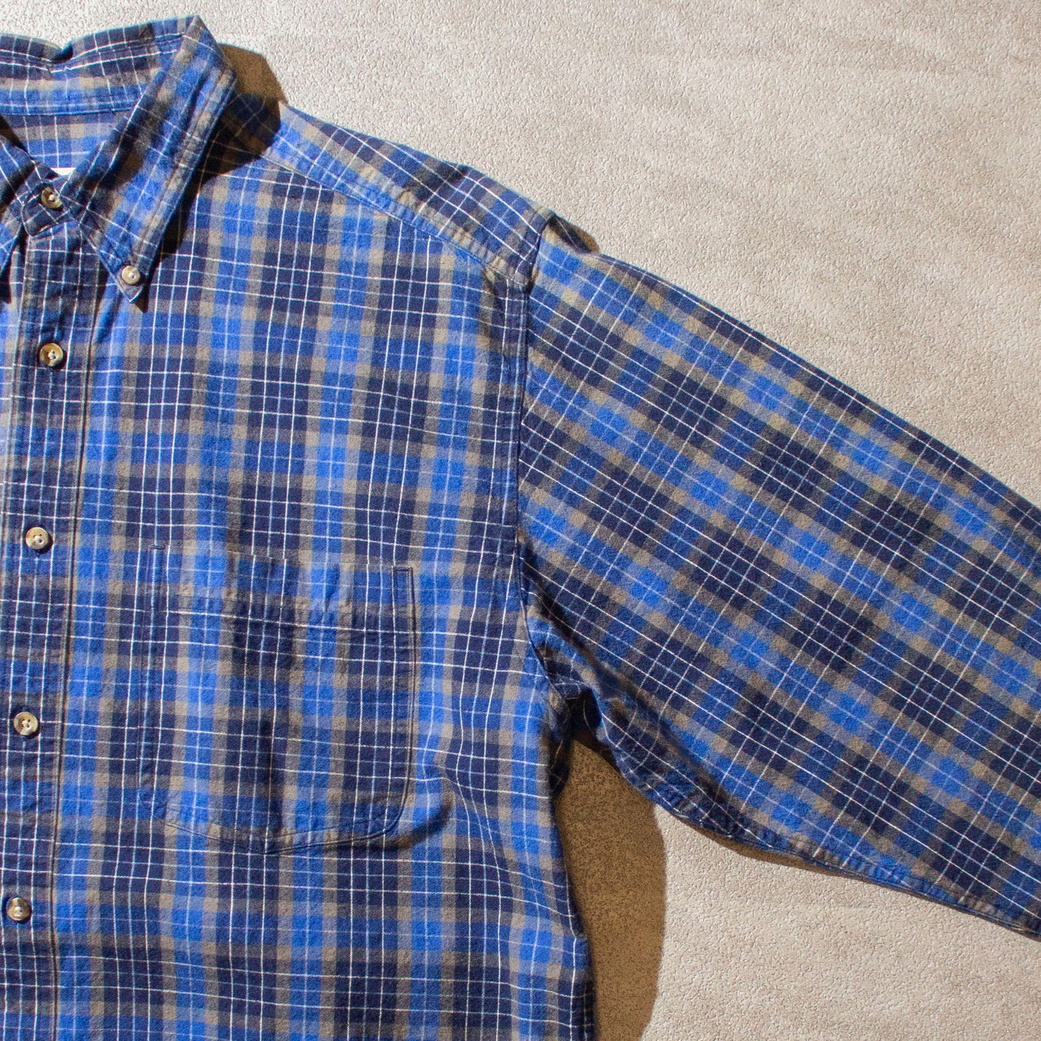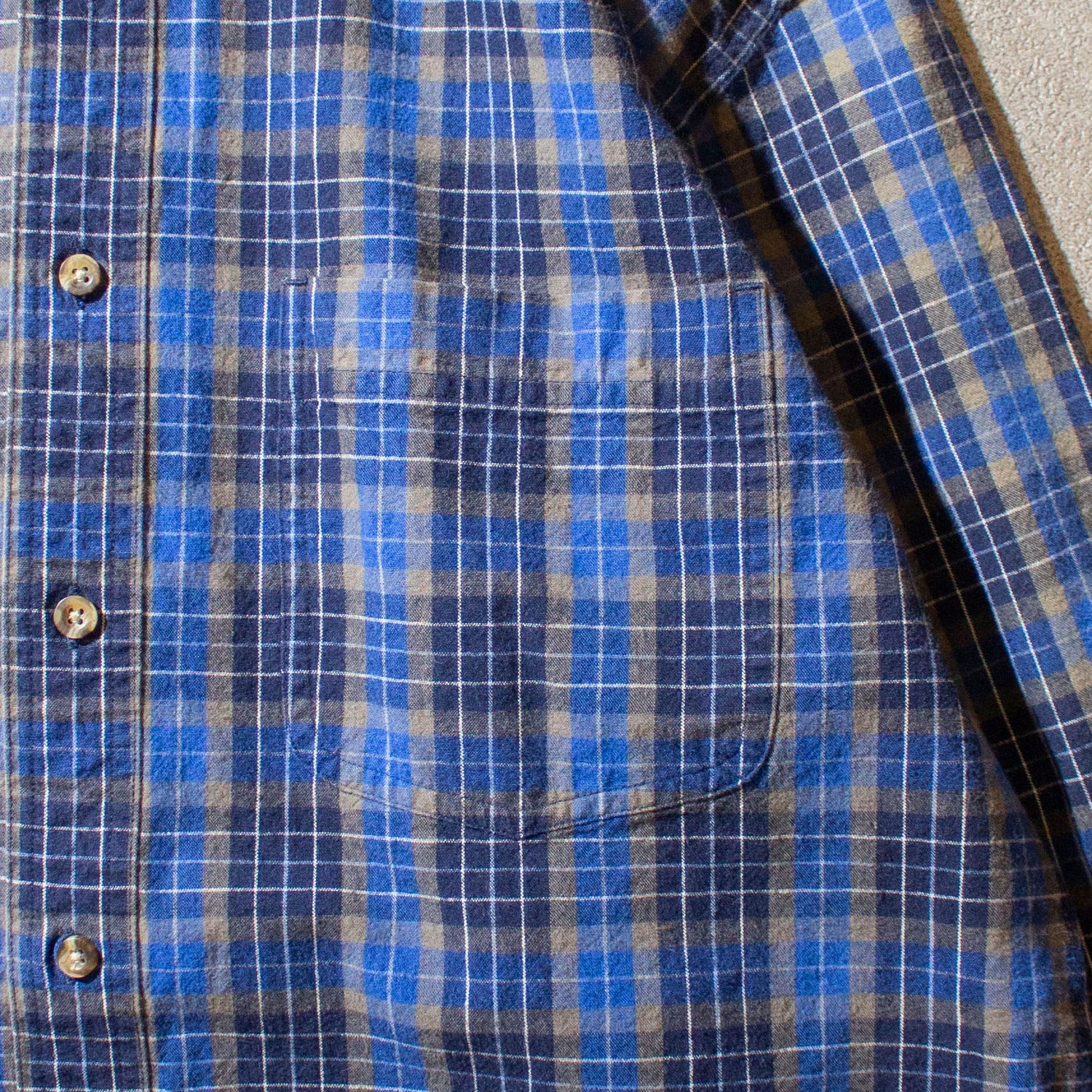 ブルーを基調とした落ち着いたチェック柄が上品で、古着らしい自然なフェード感も魅力。程よく力の抜けたカジュアルスタイルから、インナー使いまで幅広く対応する万能な一枚です。現行ではあまり見かけない独特の生地感を持つ、Eddie Bauerらしい隠れた良作です。