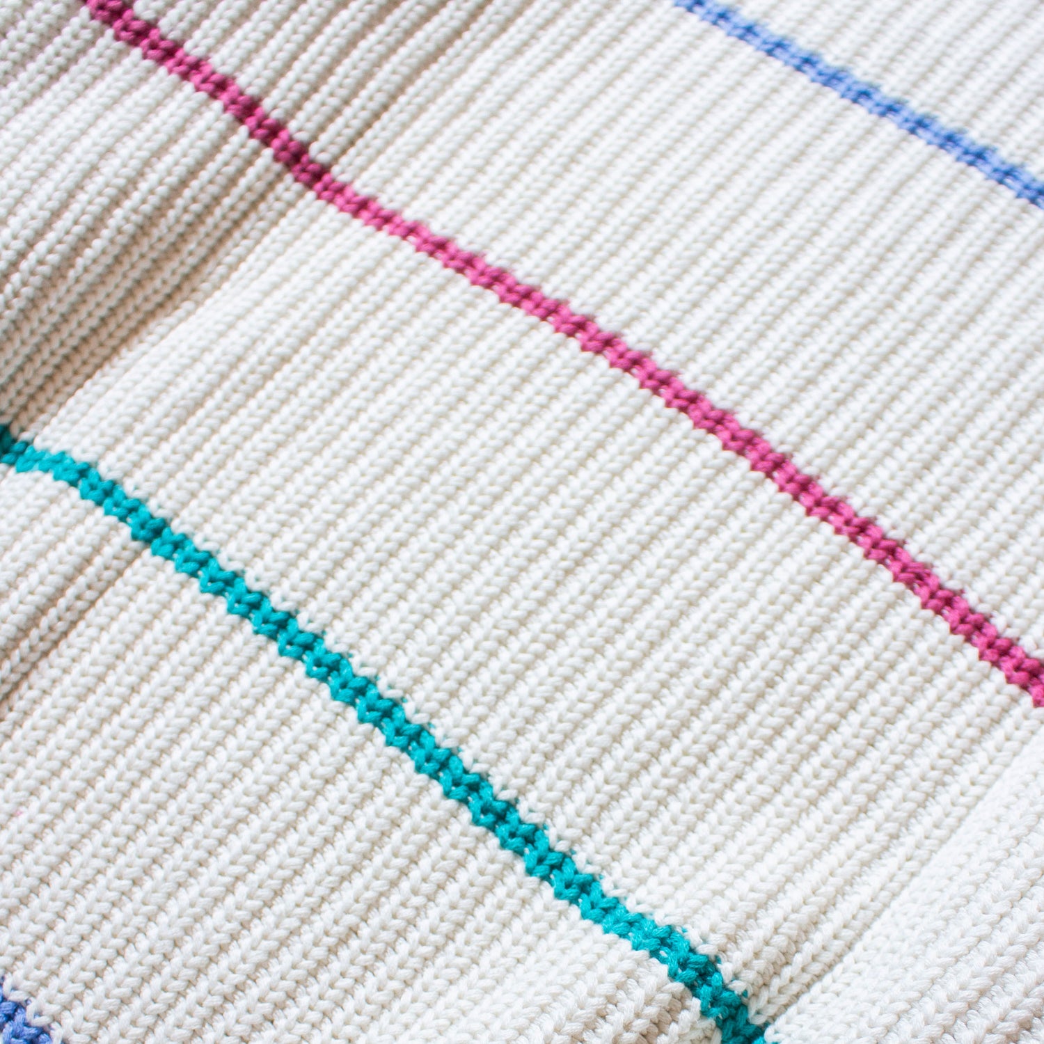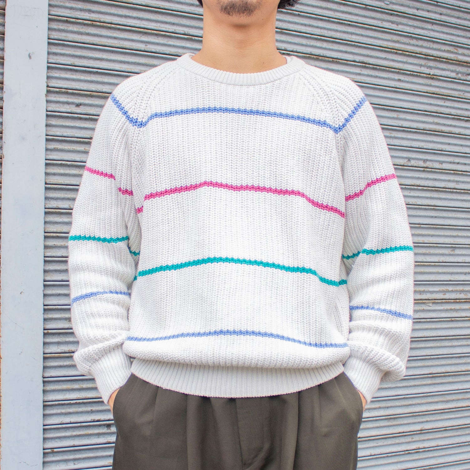 洗えるコットン素材のため、秋から春まで長く活躍してくれる万能な1着です。ホワイトベースにカラフルなボーダーを配したデザインが印象的で、ニットでは珍しい配色バランス。ざっくりとした編み地でリラックス感があり、太めのパンツでラフに合わせても、スラックスで整えてもサマになります。
