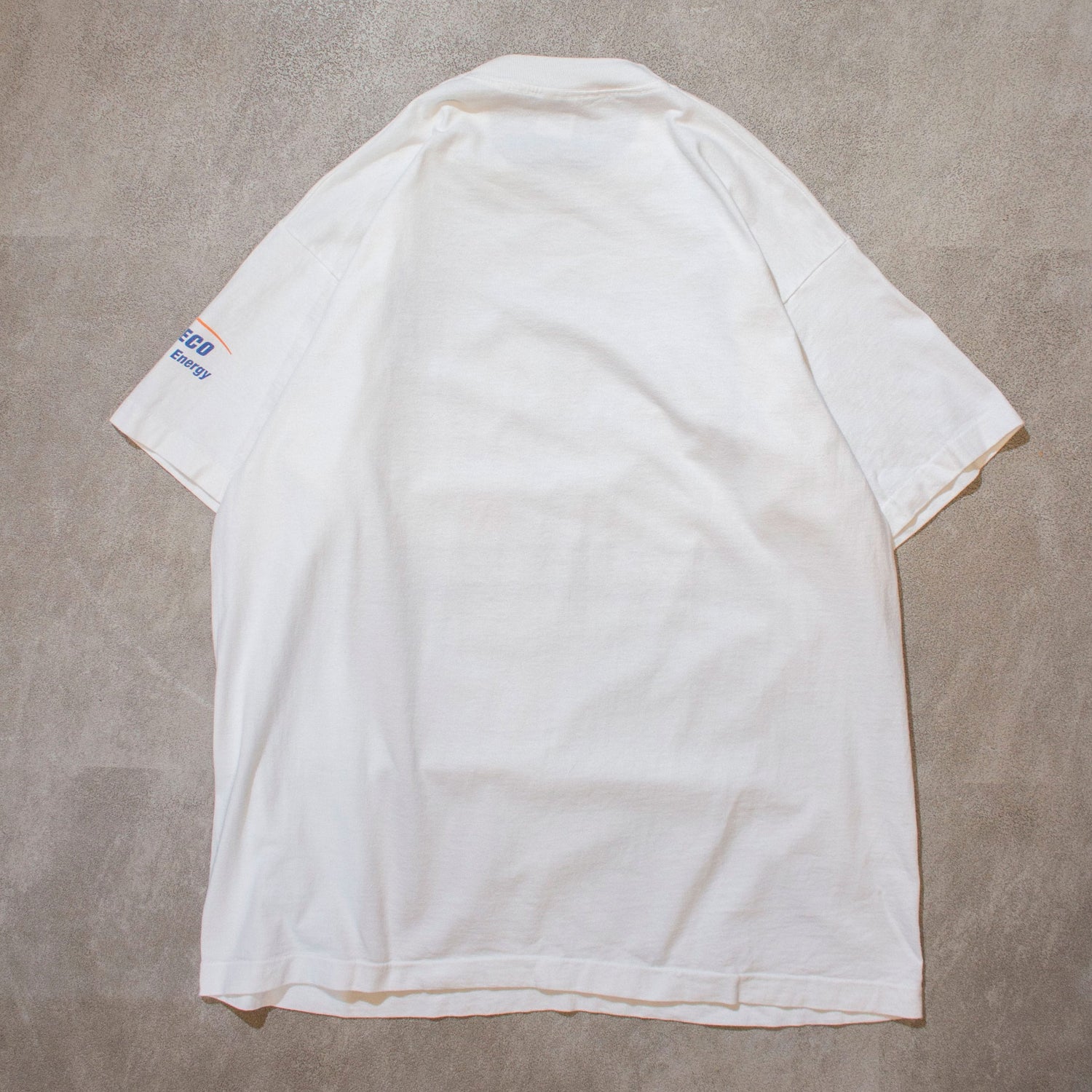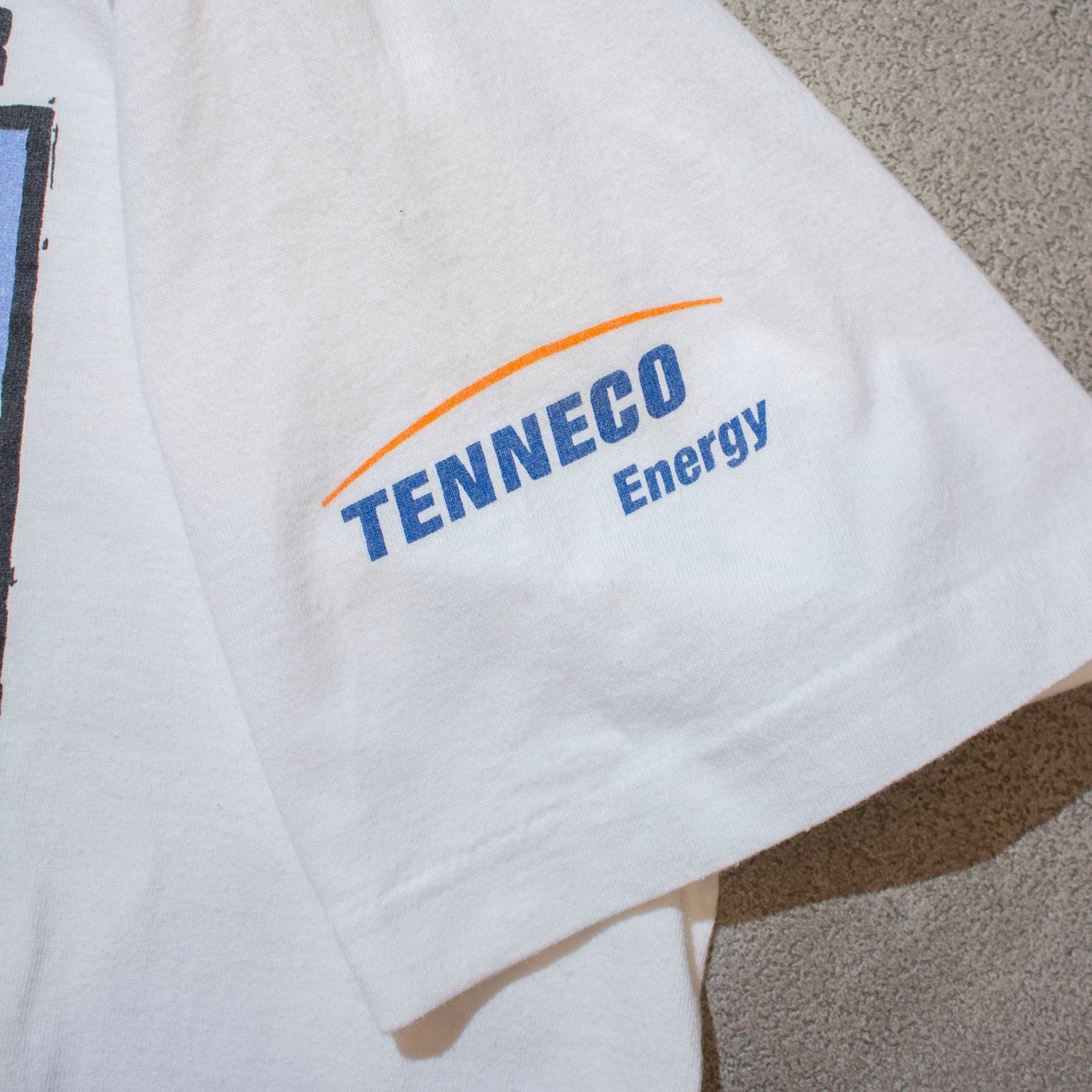 1996年にアメリカ・テキサス州で開催された「HOUSTON TENNECO MARATHON 1996(ヒューストン・テネコ・マラソン)」の完走者限定Tシャツ。フロントには、力強くゴールテープを切るランナーの姿が油彩画のようなタッチで描かれています。ランナーの背景に「工場(プラント)」が描かれており、これは当時のメインスポンサーが、エネルギー関連の大手企業であったTENNECO(テネコ)社だったことを象徴する、非常に珍しいアートワークです。