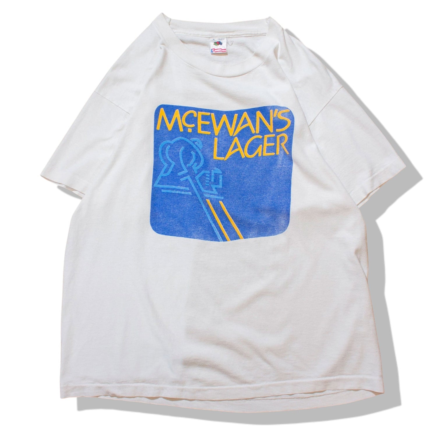 スコットランドを代表する老舗ビールブランド、「MCEWAN'S LAGER(マキューアンズ・ラガー)」のプロモーションTシャツ。フロントにはブランドを象徴する「騎士(キャバリア)」のキャラクターを抽象化したロゴがプリントされています。このキャラクターはマキューアンズの伝統的なアイコンであり、スコットランドで最も愛されたビールの1つとしての歴史を感じさせるデザインです。