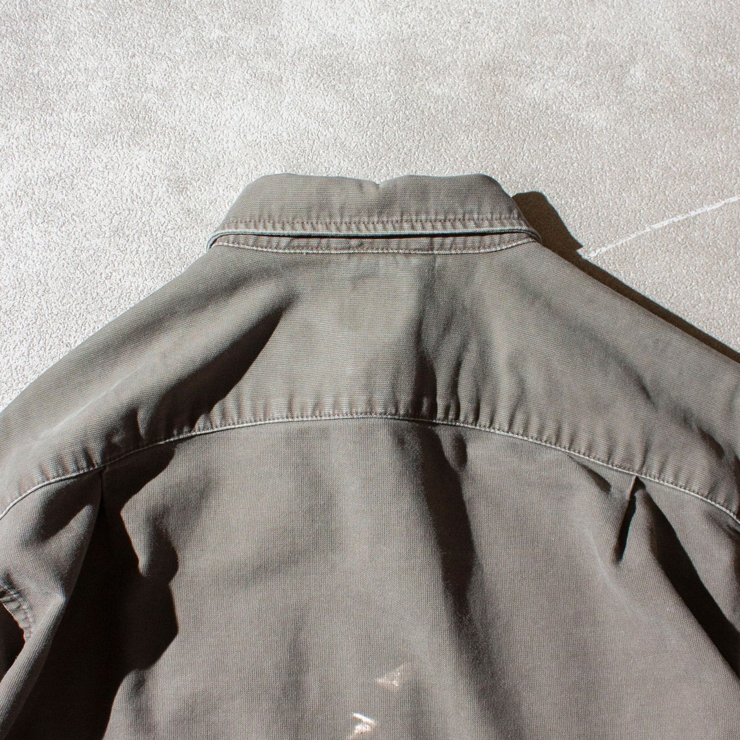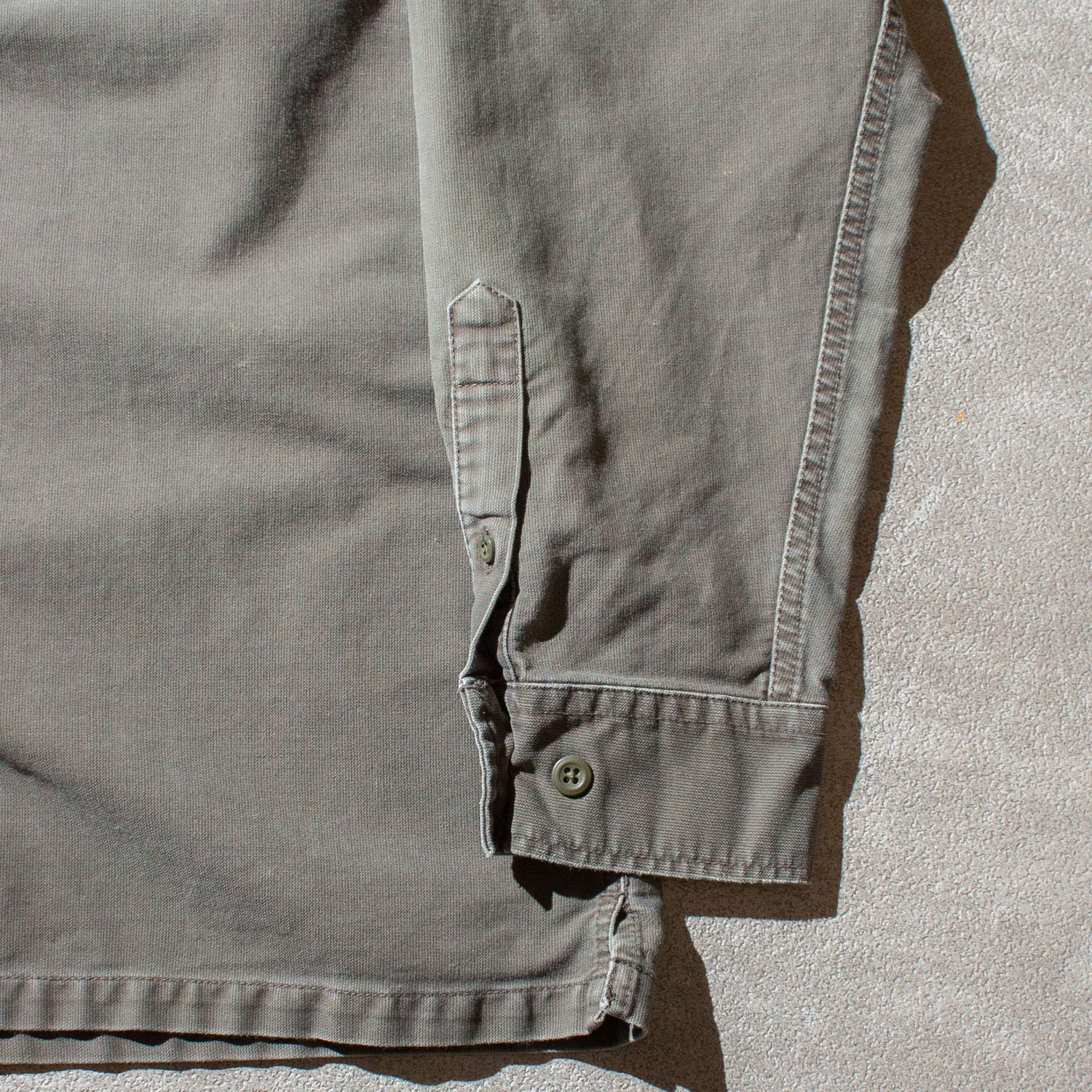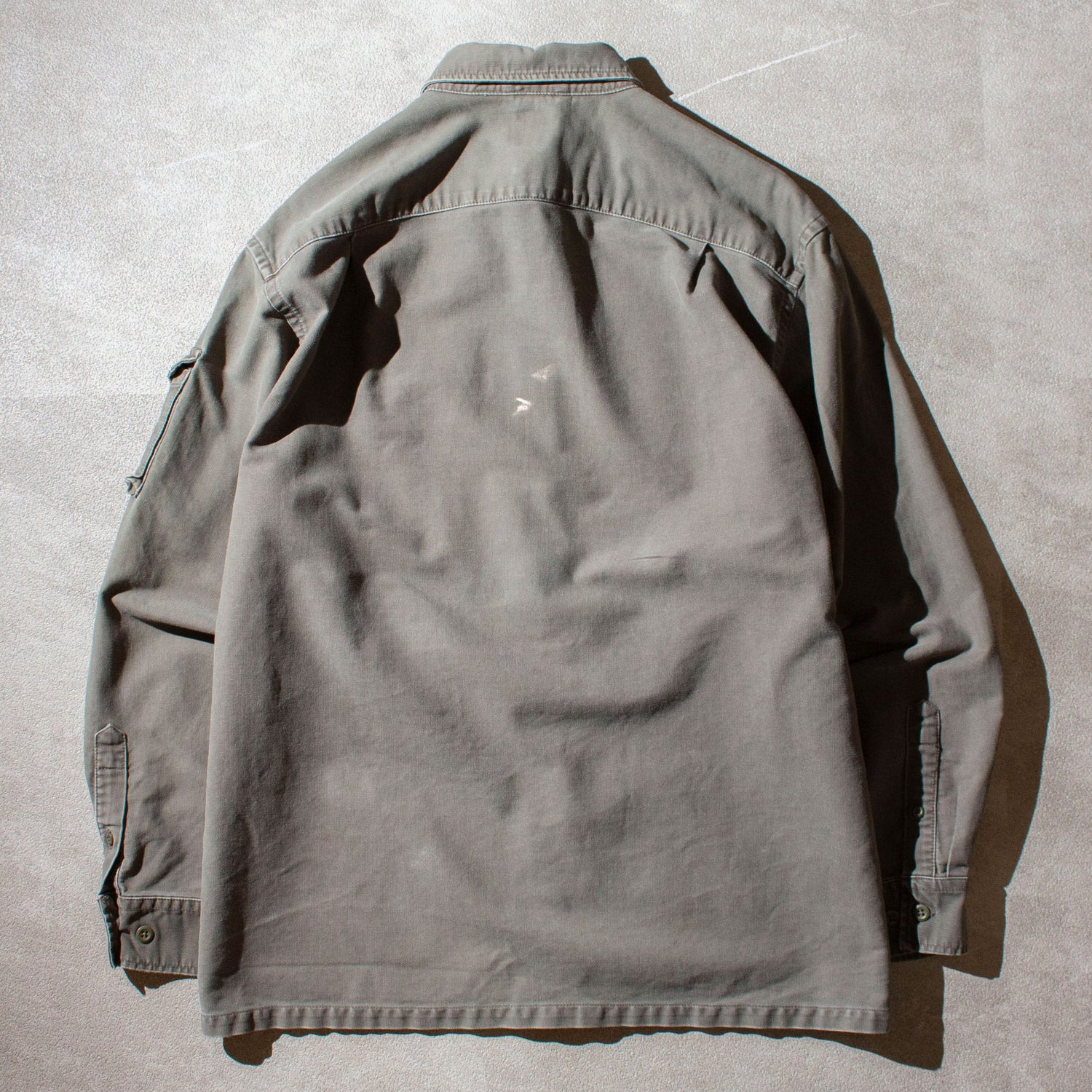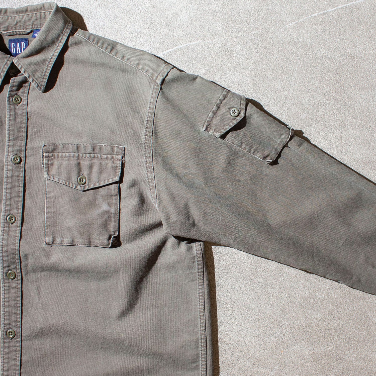 2000年代初期の GAP(ギャップ) のコットンシャツ。しっかりとしたコットンピケ素材 を使用しており、ワークシャツのようなハリ感とドライな風合いが特徴です。フロントのフラップポケットに加えて、腕に配されたユーティリティポケットがデザインなど、さりげなくミリタリーの要素を取り入れた、GAPらしいカジュアルミックスな1着です。