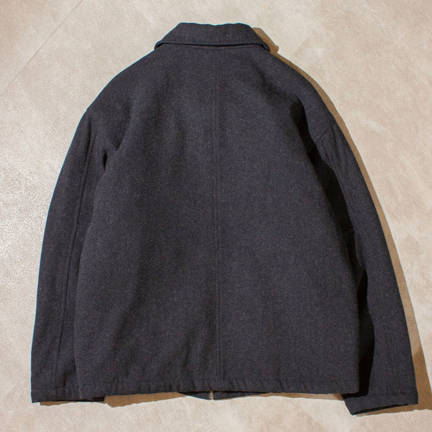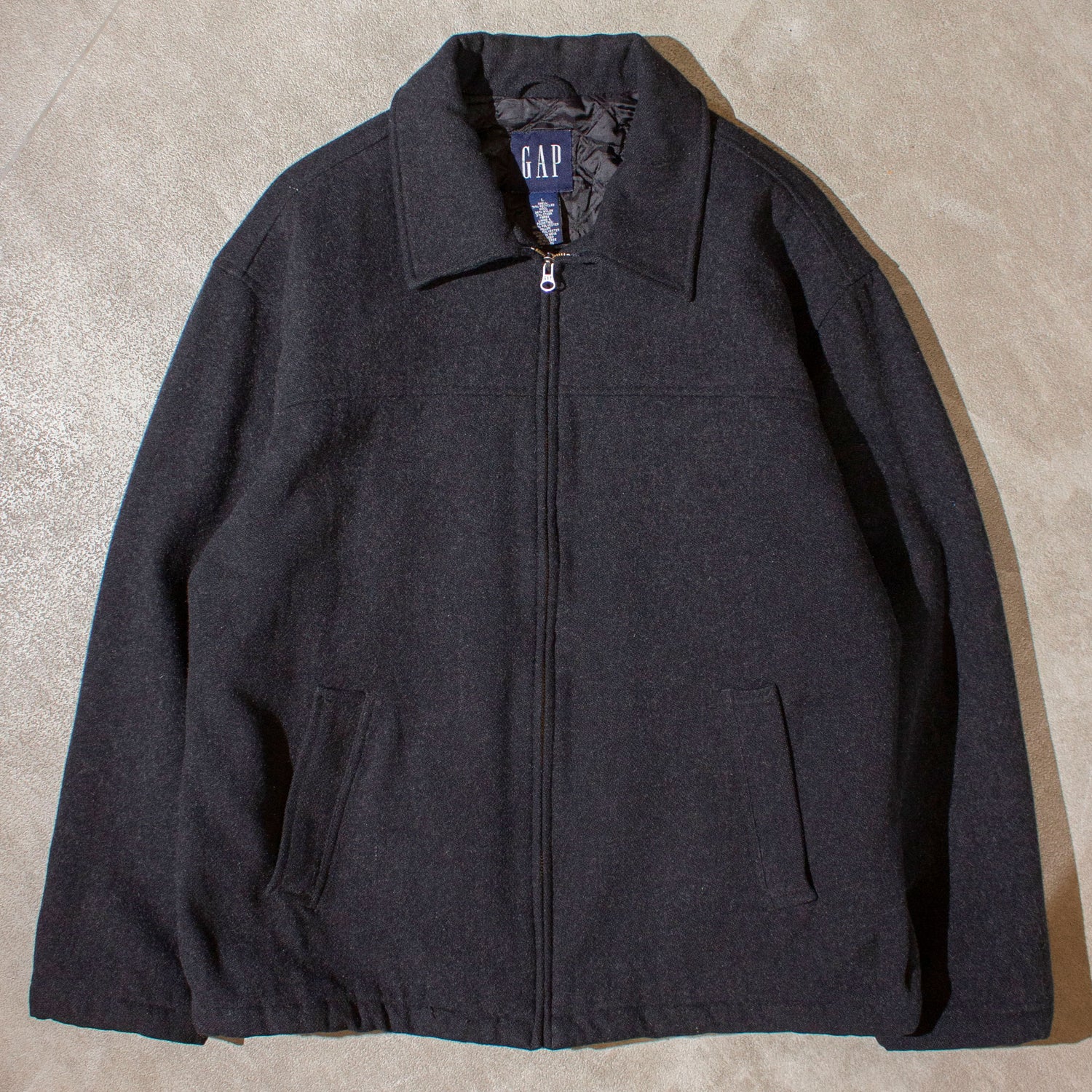 GAPの00年初期ごろの定番スポーツジャケット。既存の生地を細断し、再紡績して作られた リサイクルウールを使ったメルトン生地を採用しており、現在では当たり前になったサステナブル素材を早い段階から取り入れていた点は、さすが世界的ブランドのGAPといったところ。リサイクルウールならではの白っぽいネップが混ざり、奥行きのあるダークグレーに仕上がっております。