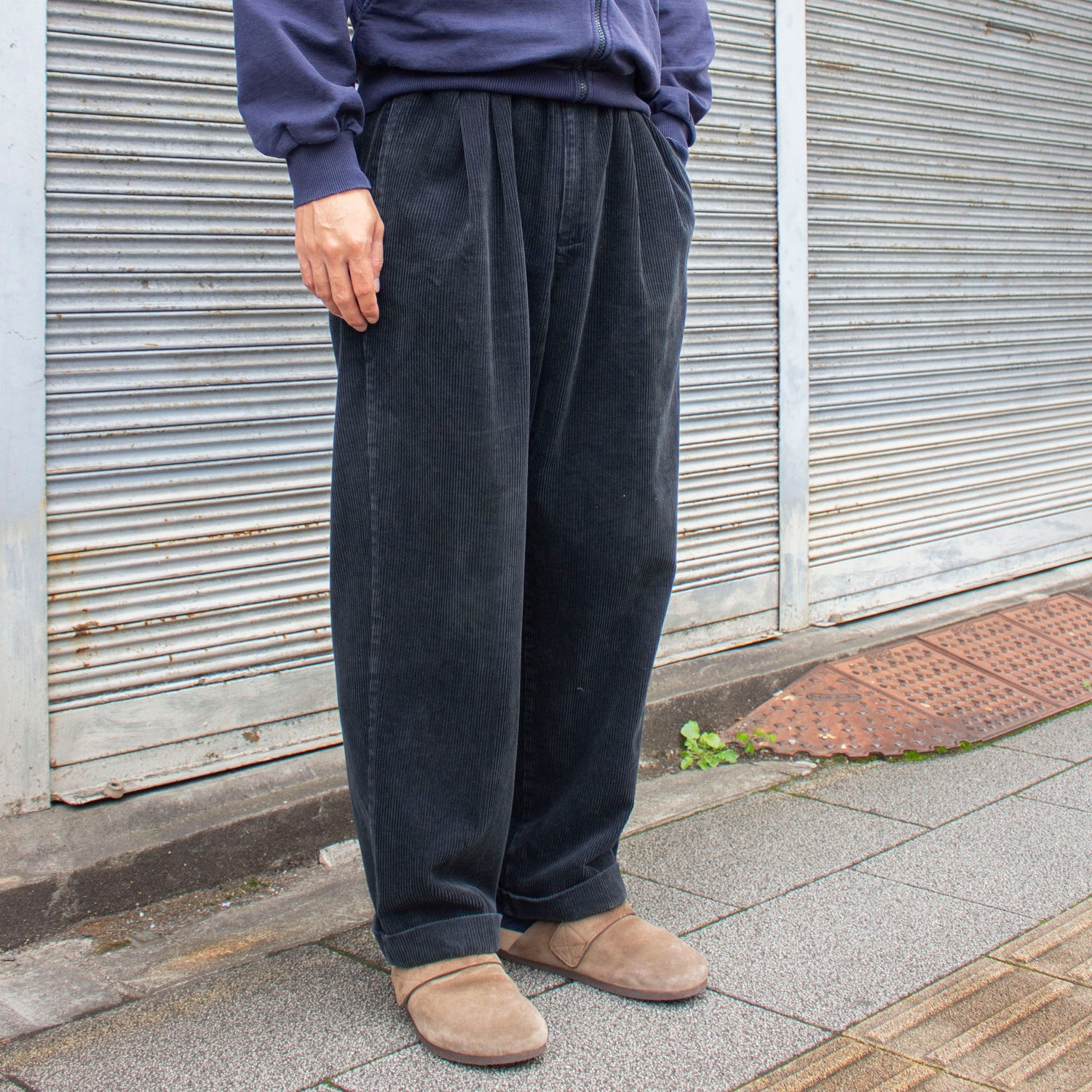 働く大人のオフスタイルを意識した設計で、休日に大き目なニットやスウェットと合わせるような、肩の力を抜いたスタイルを想定していました。素材はやや太畝のコーデュロイ。光の当たり方でわずかに青みを帯びるブラックカラーが上品で、落ち着いた艶感です。ワタリ幅約40cmの極太シルエットながら、裾にかけてわずかにテーパードしたストレートに近いラインで、太さがありながらも全体のバランスが美しい1本です。
