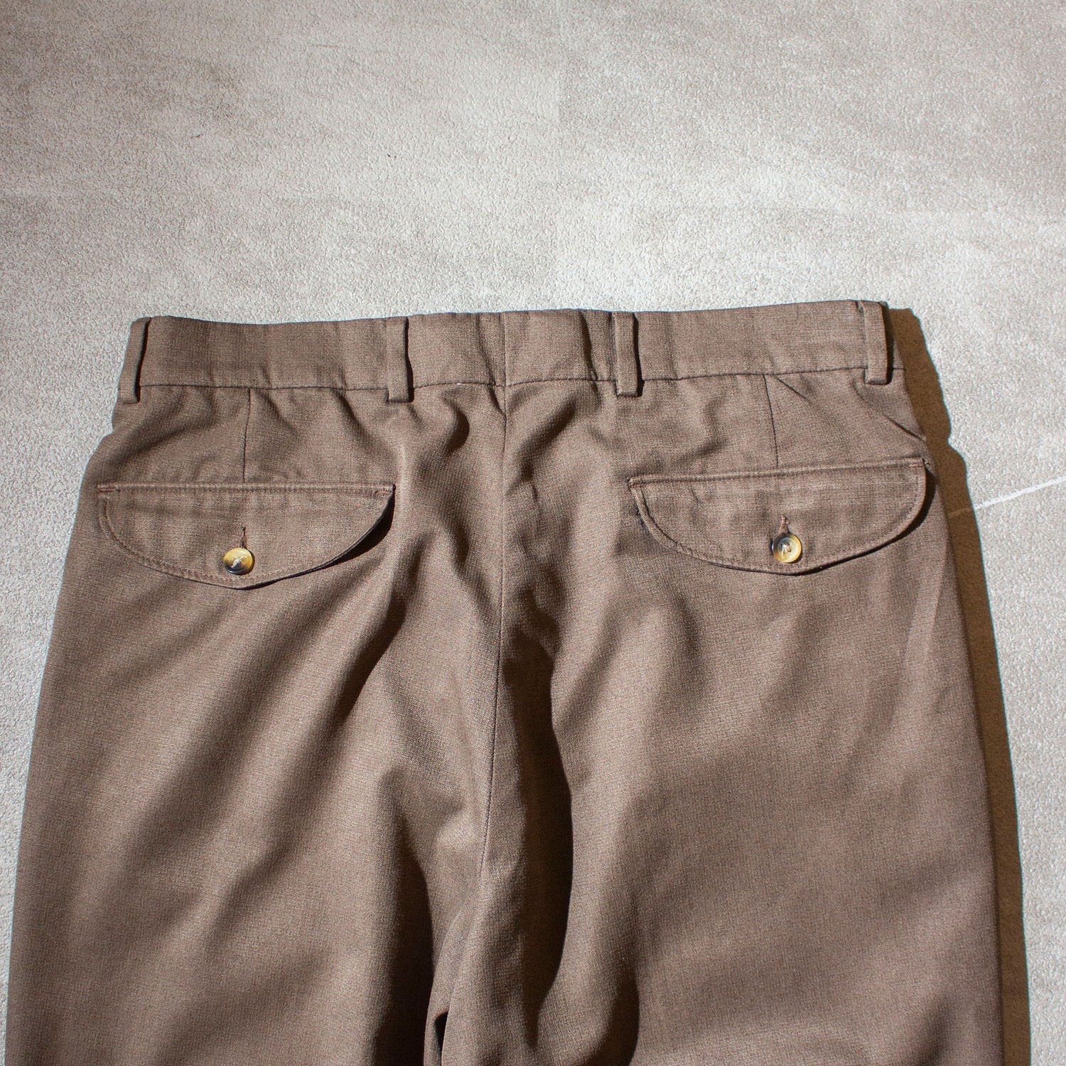ブラウンのポリエステル生地は、わずかに光沢を帯びた上品な色味で、柔らかく滑らかな質感。細かい同色の格子柄がシンプルながら存在感のある表情です。シルエットはストレートに近い緩やかなテーパードラインで、ゆとりがありながらもスッキリとしたバランス。2タック仕様による自然なドレープ感も魅力です。右ポケット内には隠しジップポケット、右バックポケットにもジップが配されており、海外旅行や日常の移動時にも安心のディテール。