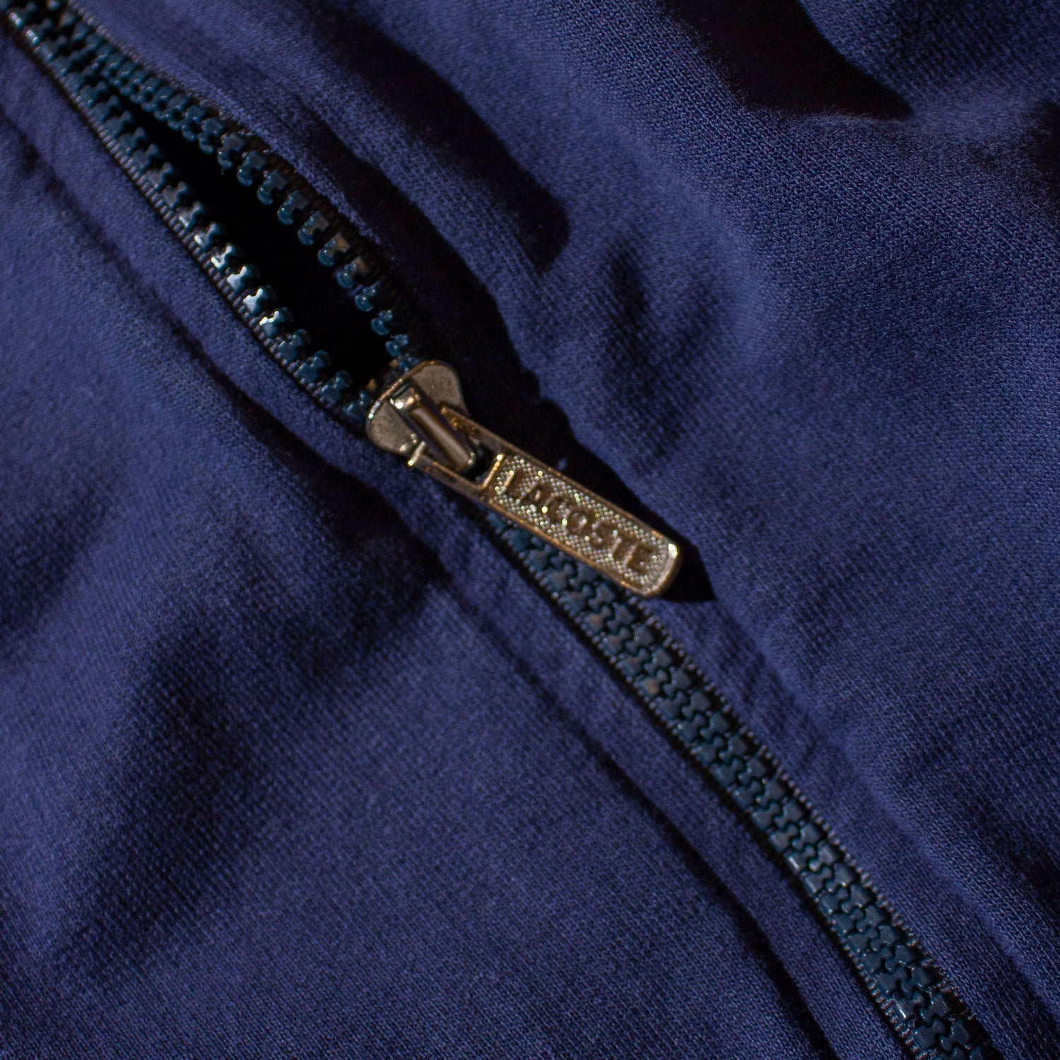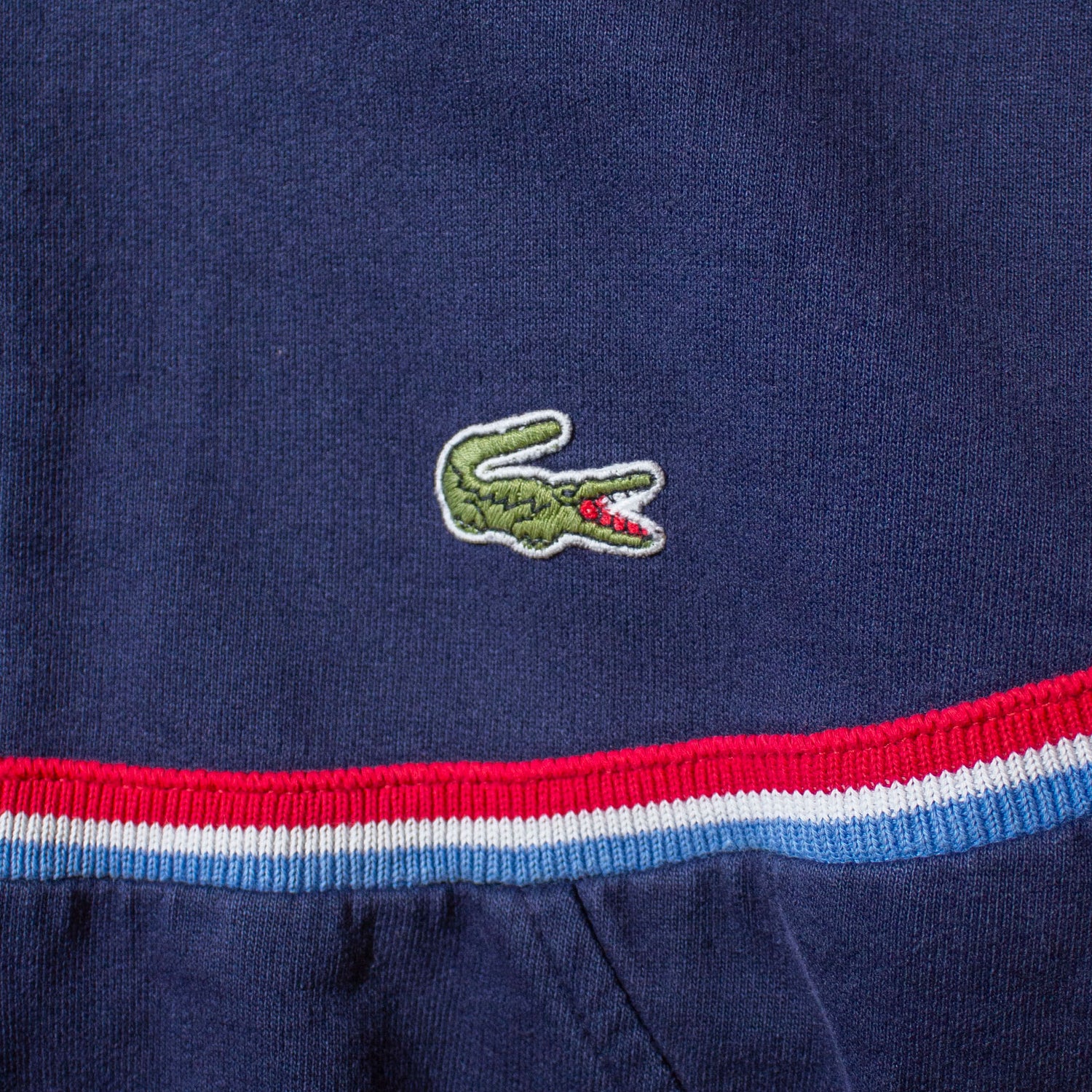 アームホール・身幅ともにゆとりをもたせたシルエットながら、短めの着丈でバランスよく着こなせます。ネイビーボディに映えるトリコロールラインと胸元のワニロゴが印象的。軽い羽織としてはもちろん、冬場にはインナーとしても活躍する万能な1着です。