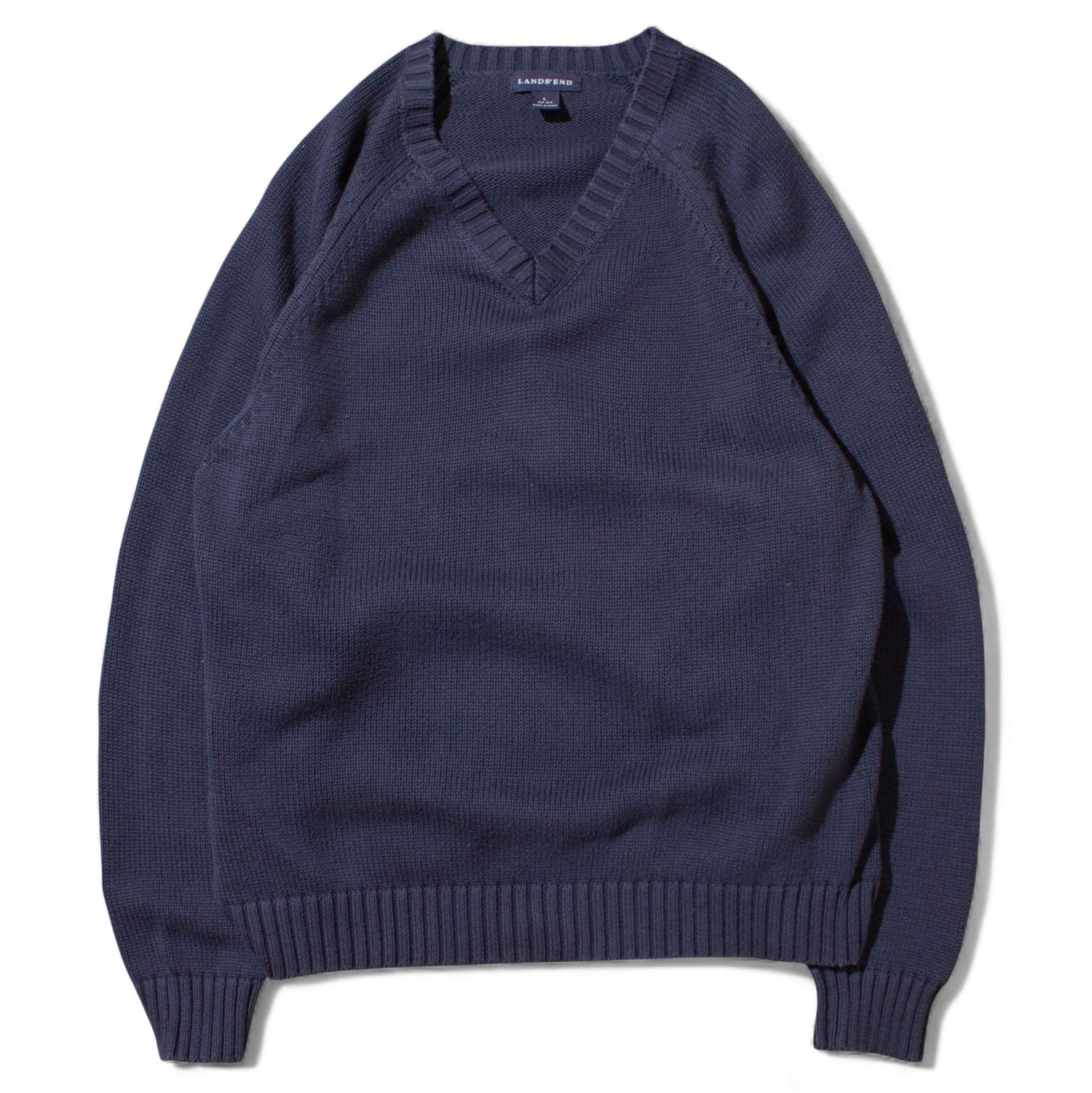Lands'EndのコットンVネックニット。平編みでドライな質感の軽い着心地で、まさにスウェット感覚でラフに着られる1枚です。この手のニットは胸元にロゴ刺繍が入って学生っぽい印象になりがちですが、こちらは完全無地なので大人でも取り入れやすいのが魅力。