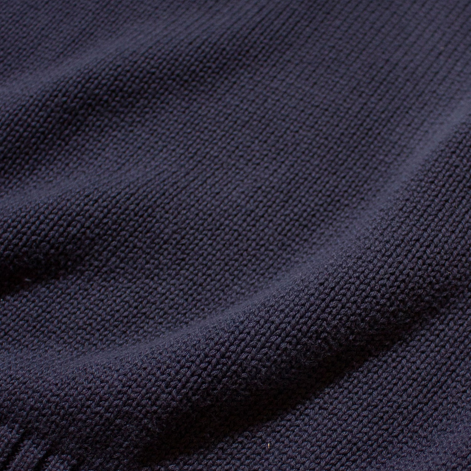 Hanesの白Tの上にそのまま重ねて、太めのチノパンをルーズに合わせるだけでもサマになりますし、冬はジャケットやコートのインナーとしても重宝します。シンプルで扱いやすく、ワードローブに一枚あると確実に活躍するニットです。