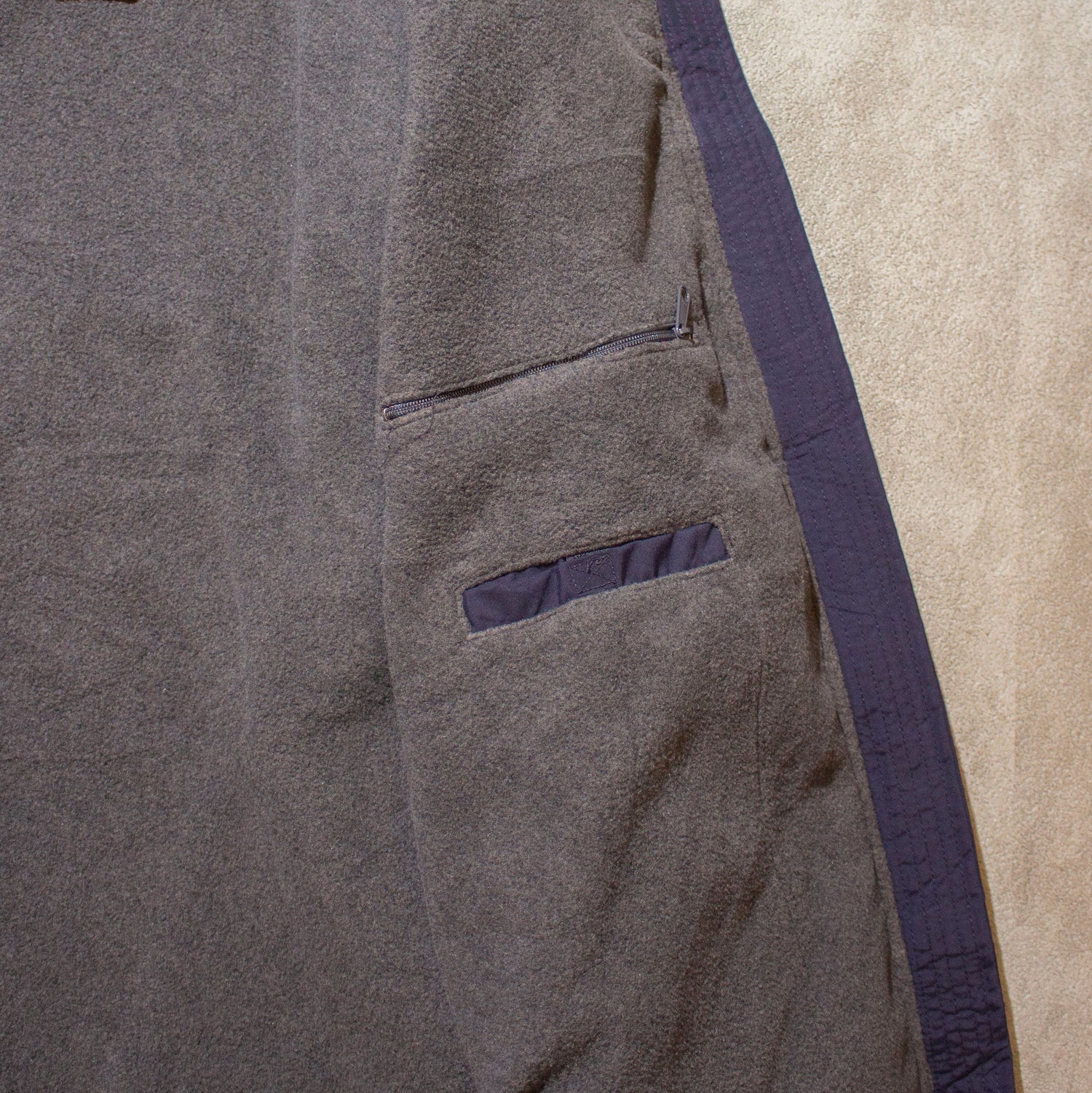 裏地はフリースの真冬仕様で風も通しにくく1枚でしっかり暖かい作り。カラーはかなり暗めのダークネイビーで大人っぽく落ち着いた印象です。身幅は広めでラグランスリーブのためインナーをしっかり着込める余裕があり、着丈も長すぎないので丸みのあるシルエットで着用していただけます。