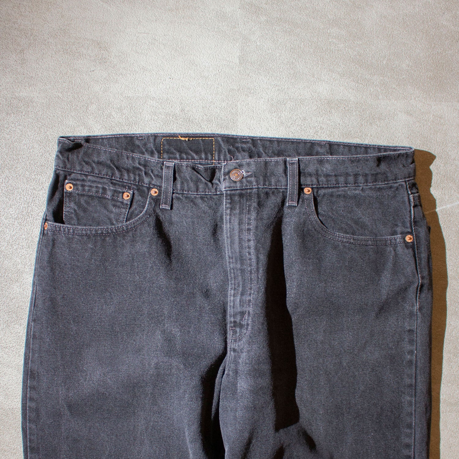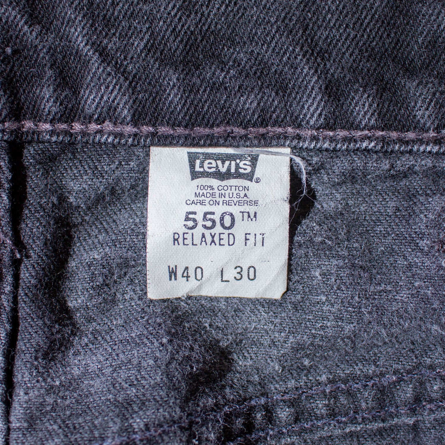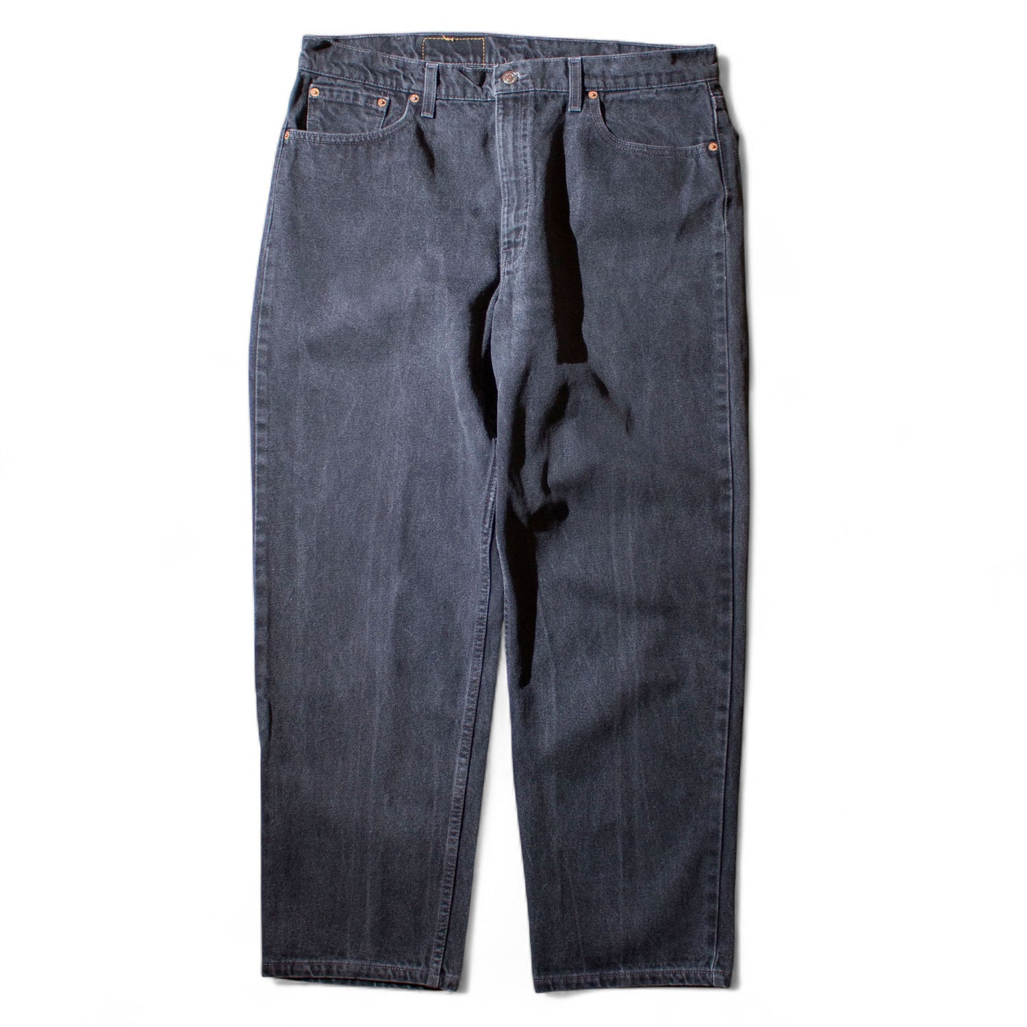 Levi’sのワイドデニムの品番550のブラック。タグに”TAPERED”と表記の入らない個体で一般的な550に比べテーパードが少なくストレートに近いシルエットで穿いていただけます。