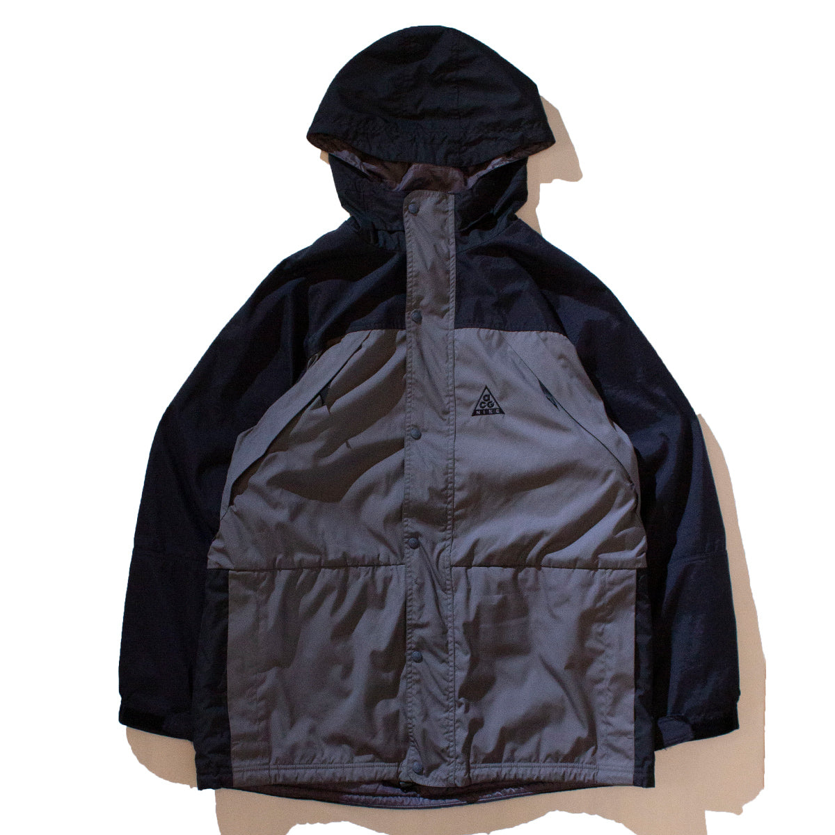 NIKE ACGのマウンテンパーカ。NIKE ACG(ナイキ エーシージー)は、「All Conditions Gear」の略で、1989年にナイキが立ち上げたアウトドア向けのラインです。ブラック×チャコールの切り替えが都会的でソリッドな印象です。シェルはポリエステル(チャコール部分)とナイロン(ブラック部分)のコンビ。裏地はフリース素材となっており保温性もしっかり担保されています。