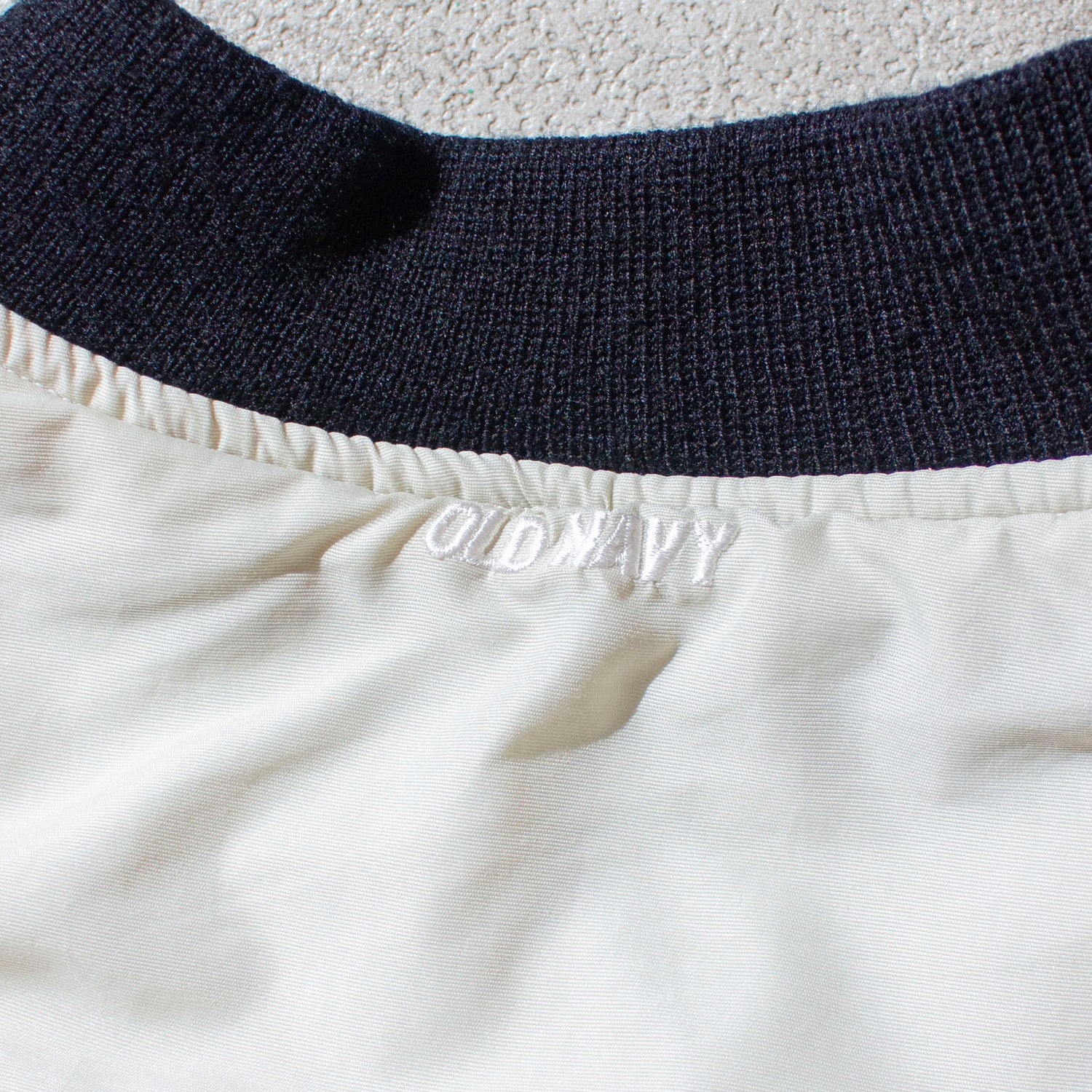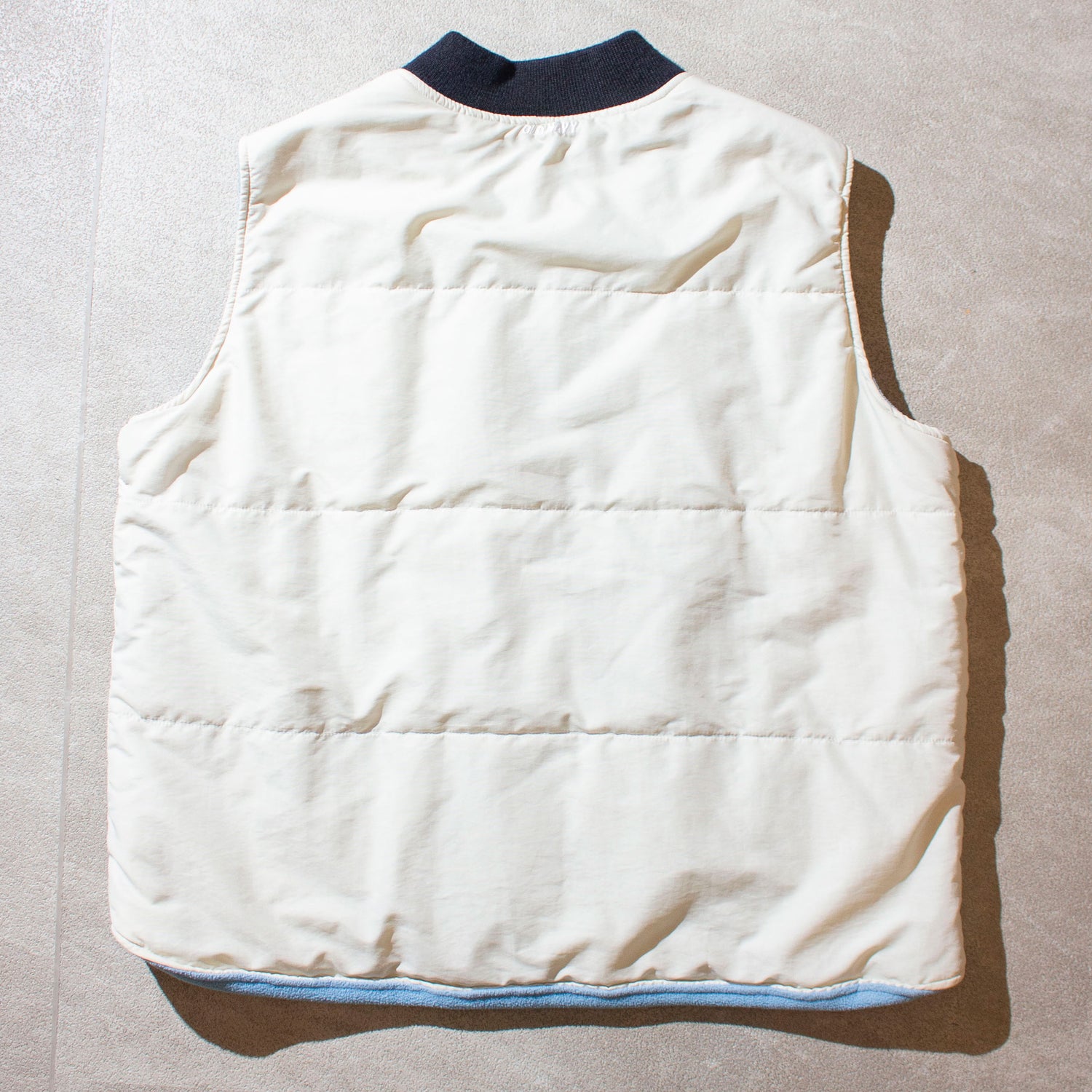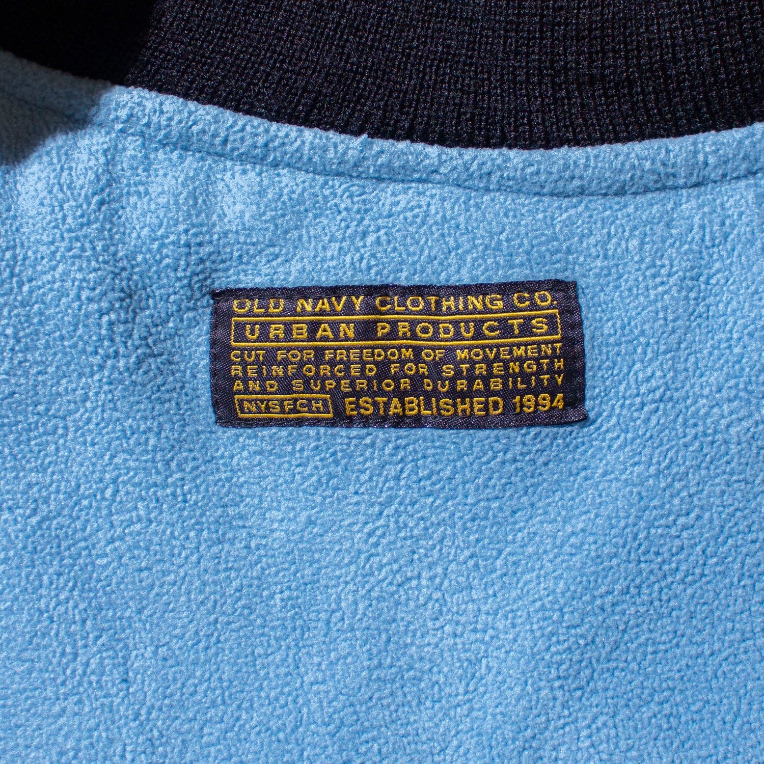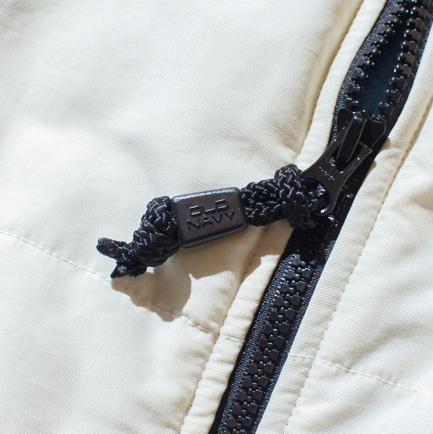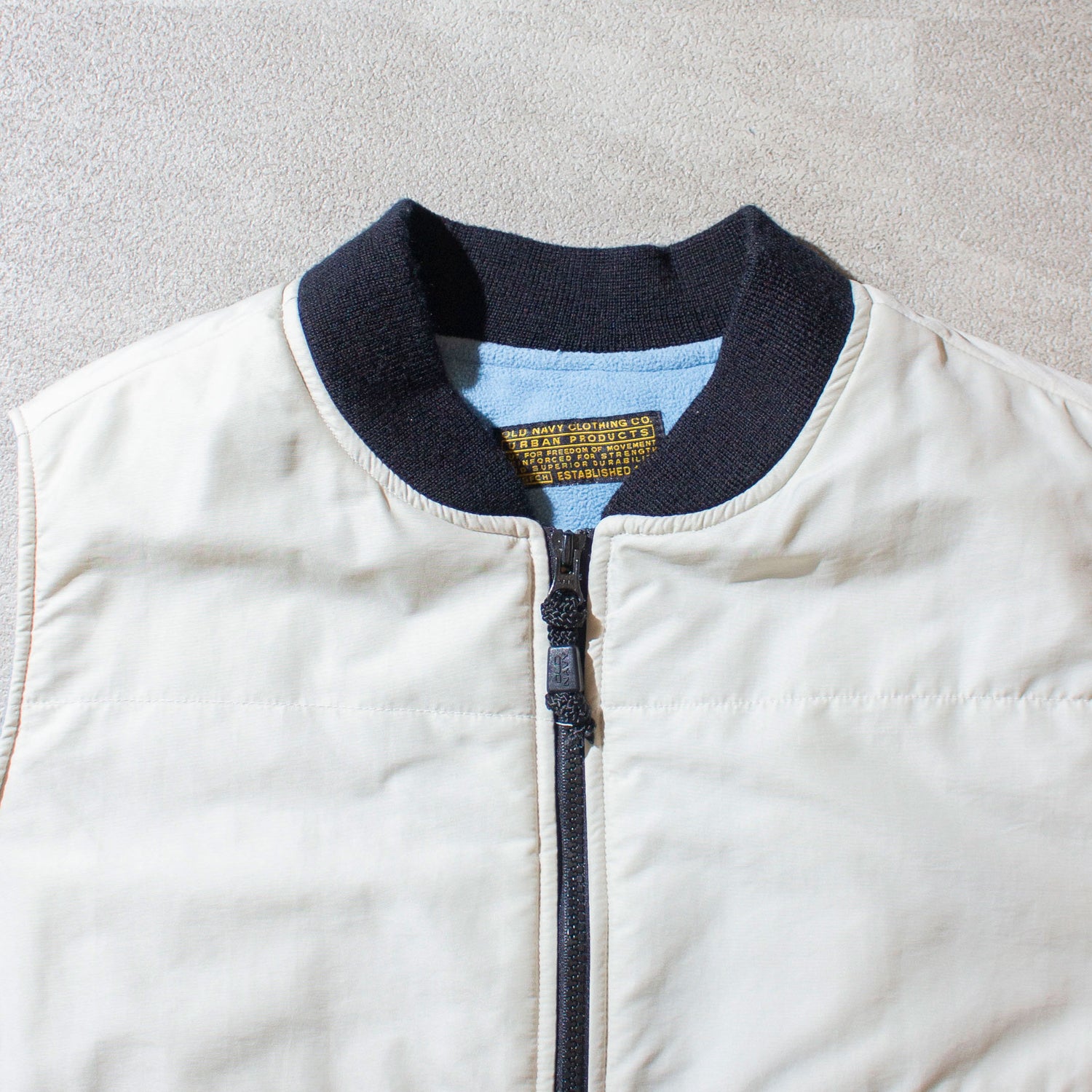 OLD NAVYのワークベスト。薄手の中綿入りで、裏地には鮮やかなブルーのフリースを採用。さりげないアクセントが効いた1着です。コンパクトな丈感なので、アウターとしてよりもインナー使いに映えるタイプ。