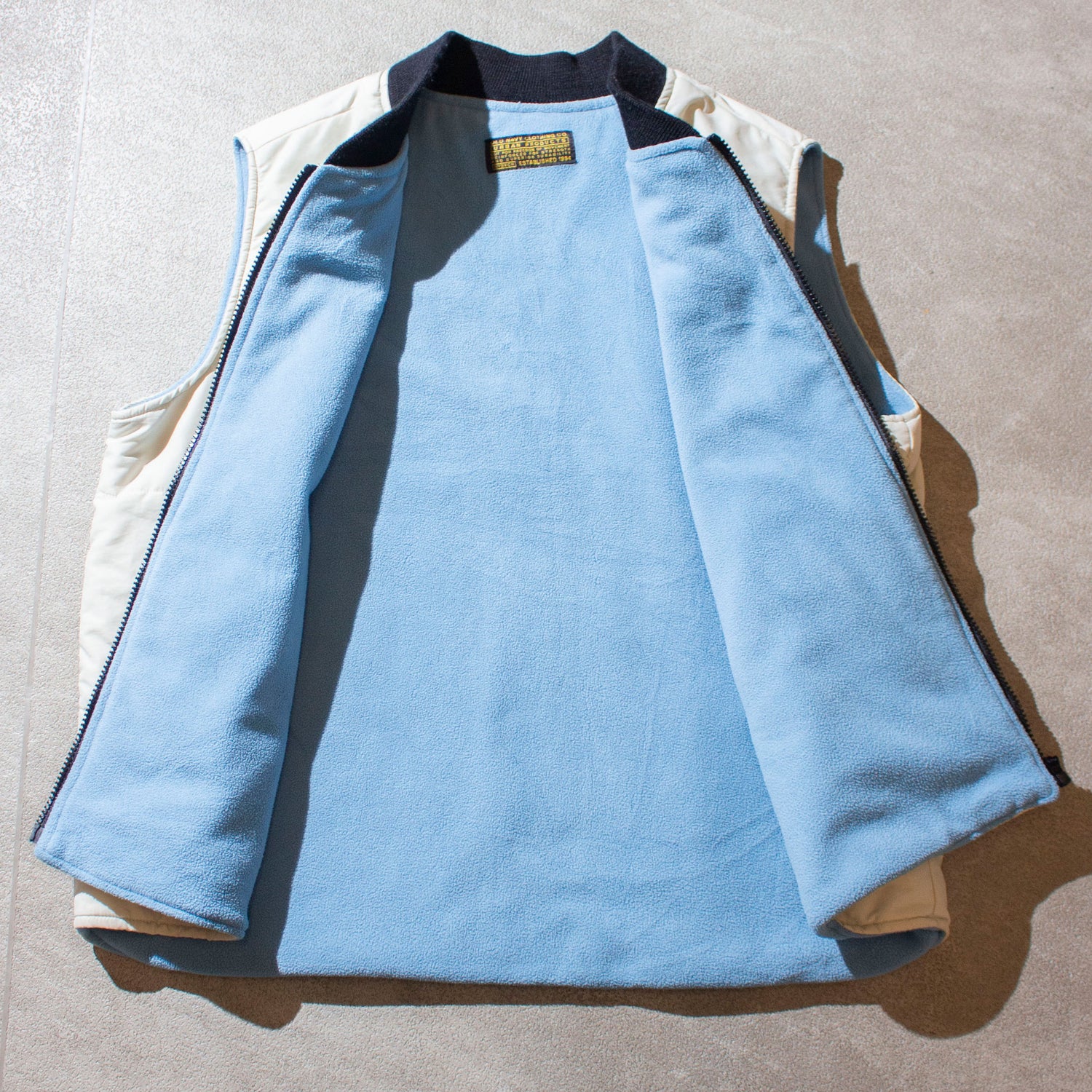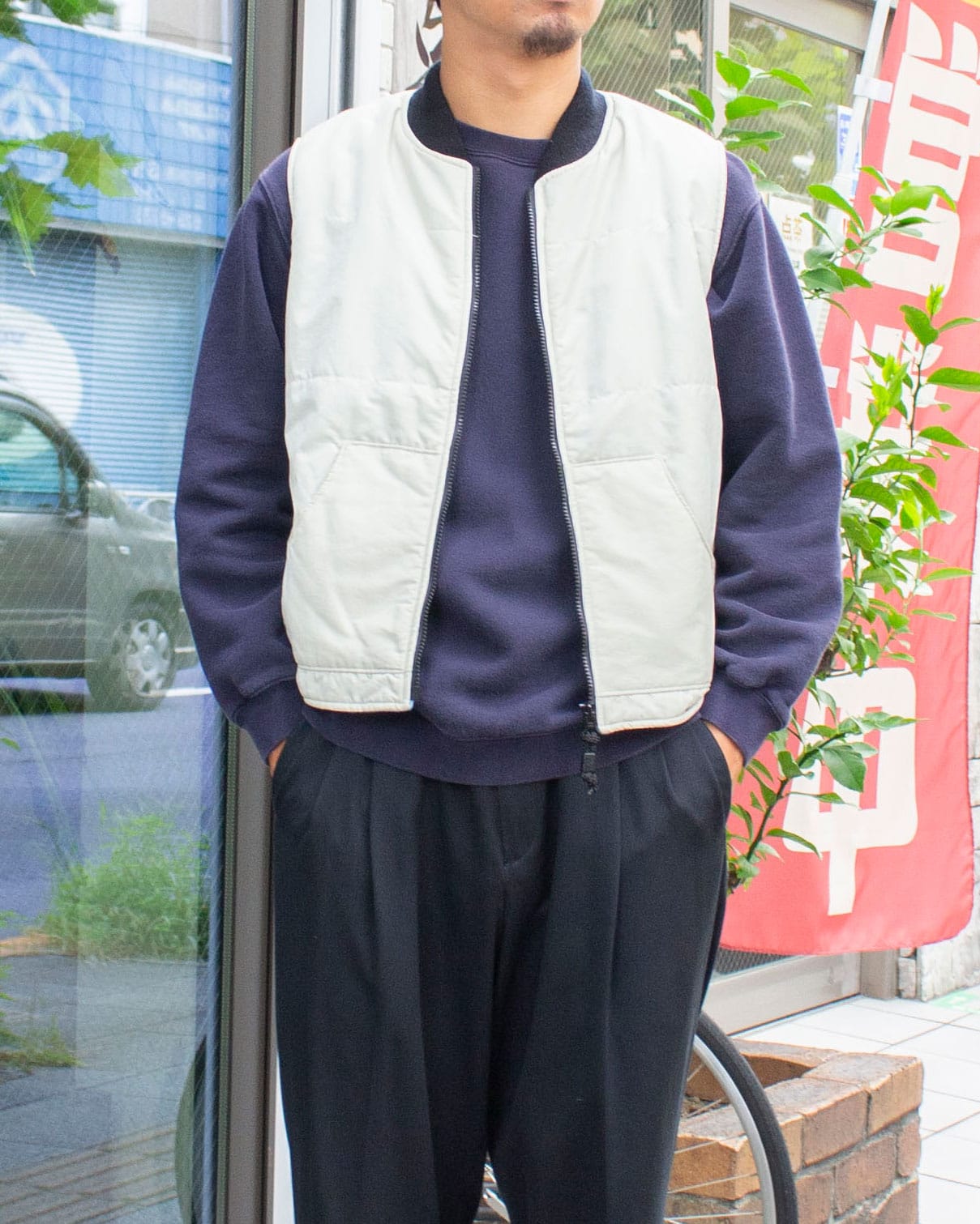 シャツの上から羽織ってその上にブルゾンを重ねれば一気に洒落感が出ますし、そもそも古着だと白のベスト自体が数の少ないアイテムなので、ビビッときた方はぜひ押さえていただきたいおすすめの1枚でございます。