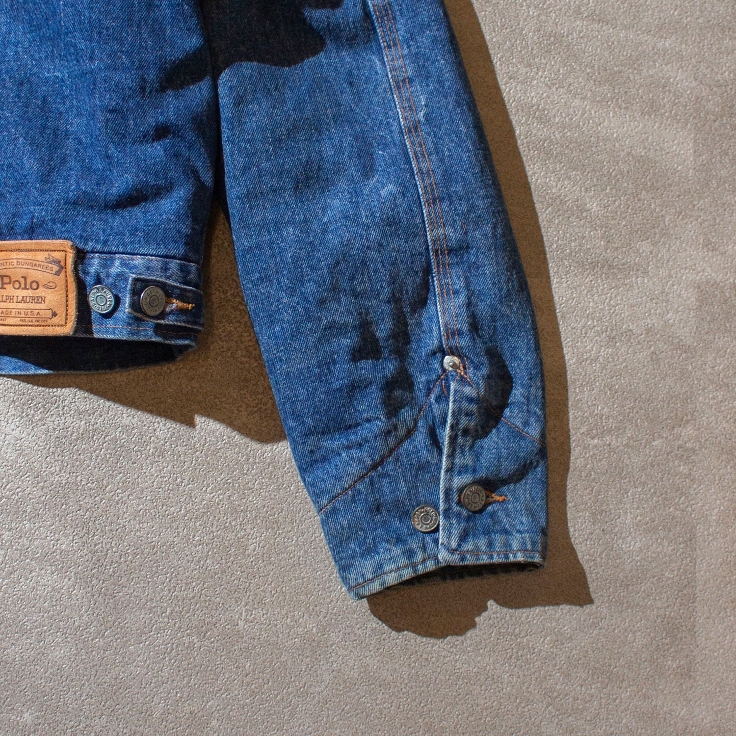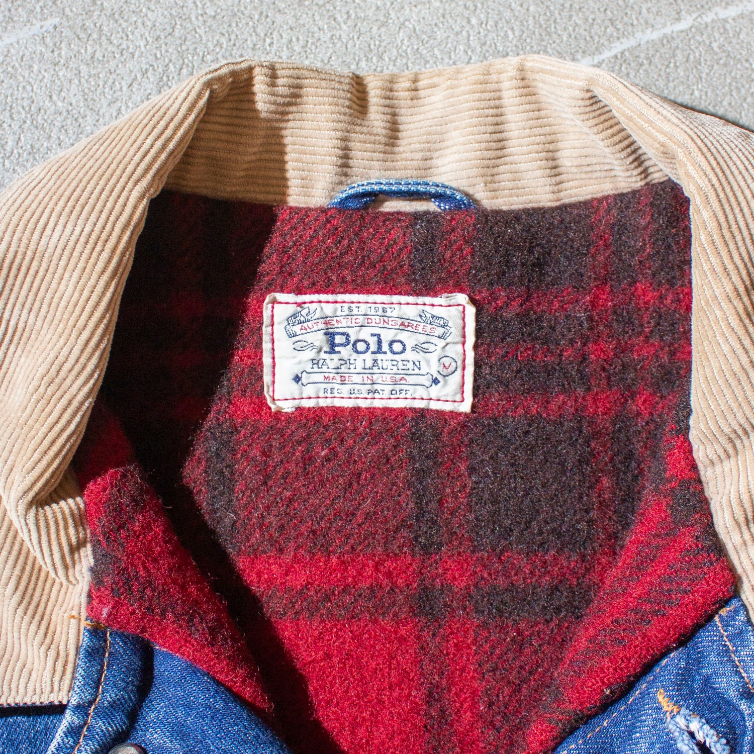 Ralph Laurenの名作デニムジャケット。カバーオールをそのまま短丈にしたようなデザインで、アクションプリーツやハンドウォーマーポケットなどの機能的ディテールを追加。襟には肌当たりの良いコーデュロイ素材を採用しており、見た目にも程よいアクセントを加えています。