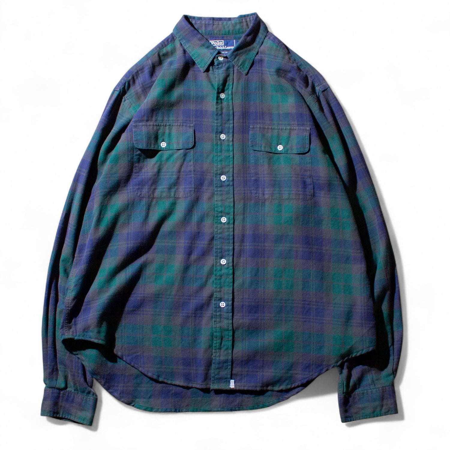 ラルフローレンの薄手なフランネルシャツ。ライトな生地感で、両胸にはフラップ付きポケットのあるワークシャツディテール。着丈は直されていてコンパクトなバランスなので、太めのパンツとも好相性です。