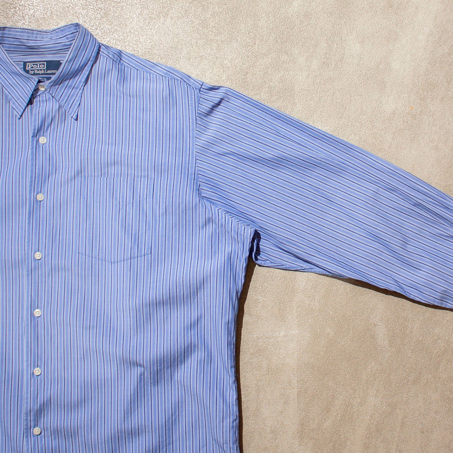 ラルフローレンのオーバーサイズドレスシャツ。胸にポニー刺繍は入らない、いわゆる“ポニー無し”。ブルーベースのストライプは白を挟まない完全なブルートーン。コントラストが強すぎずどこか都会的で落ち着いた印象。爽やかというより洗練された雰囲気です。
