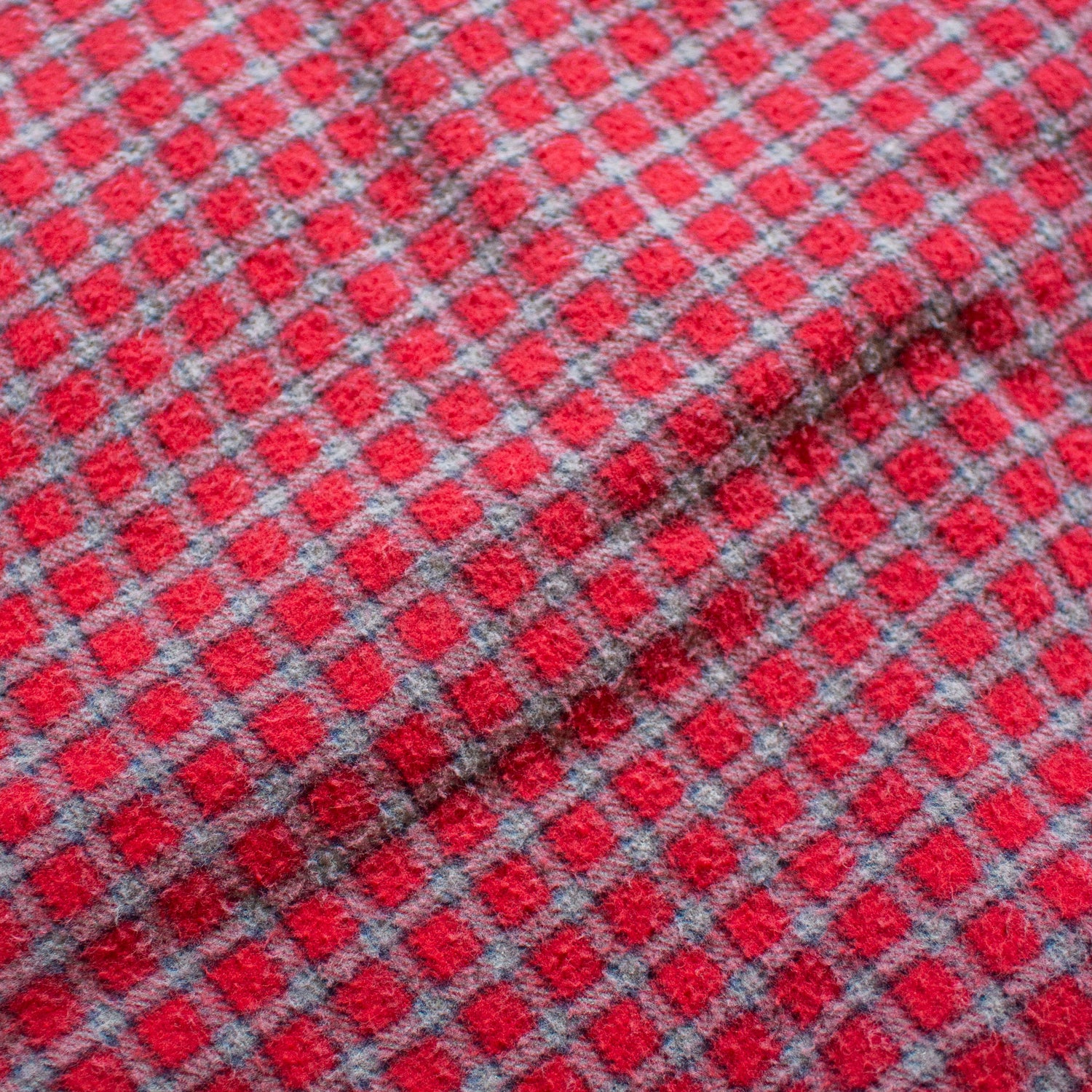粗めの毛羽立ちが特徴的なプリントネル生地で、クラシックな表情ながら軽やかな着心地が魅力です。レッドベースにグレーの格子が入った配色は存在感がありつつも派手すぎず、スタイリングの差し色としても活躍しそうです。