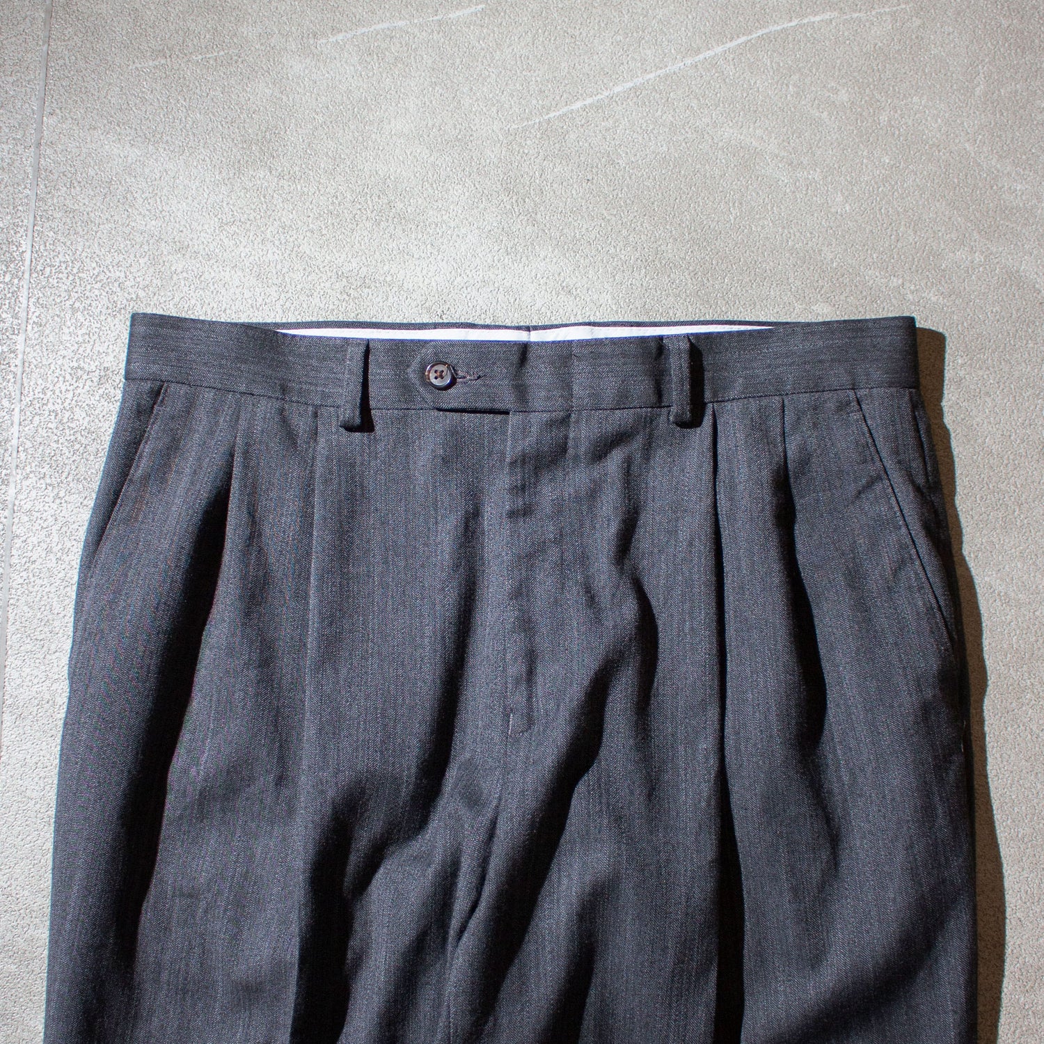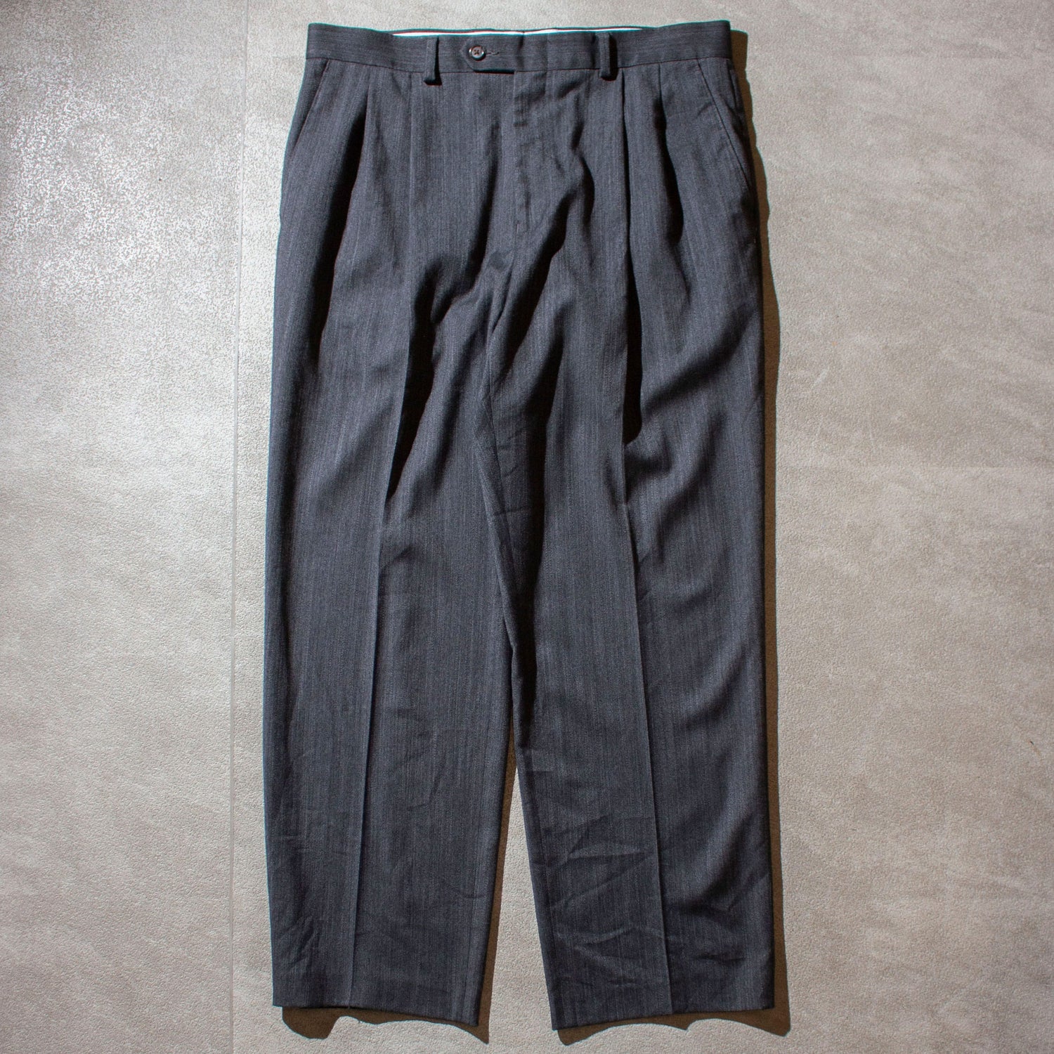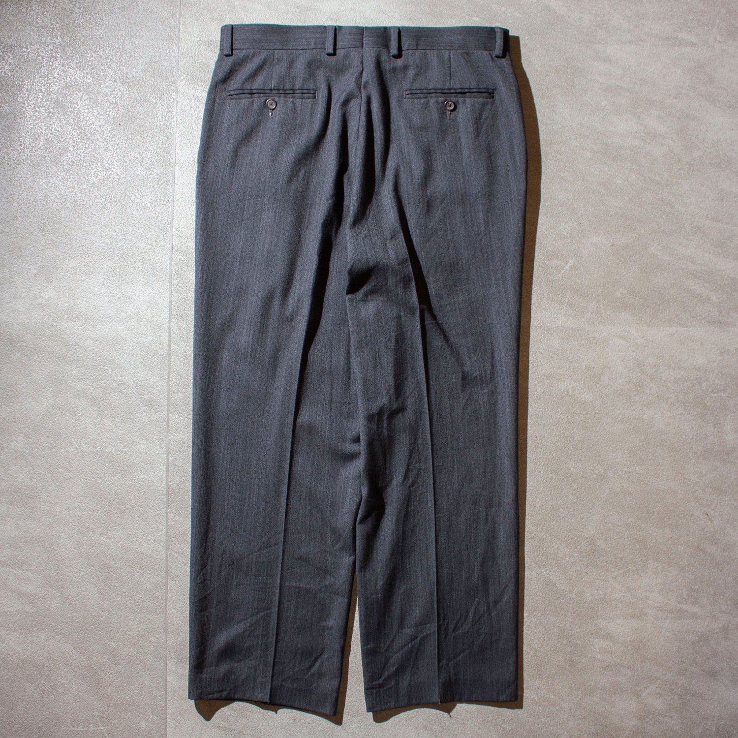 本来メインラインではウール100%で仕立てるところを、こちらはポリエステルで製作(表記消失の為恐らく)。これが逆に軽快さと独特のドレープ感を生み、抜群の穿き心地に仕上がっています。