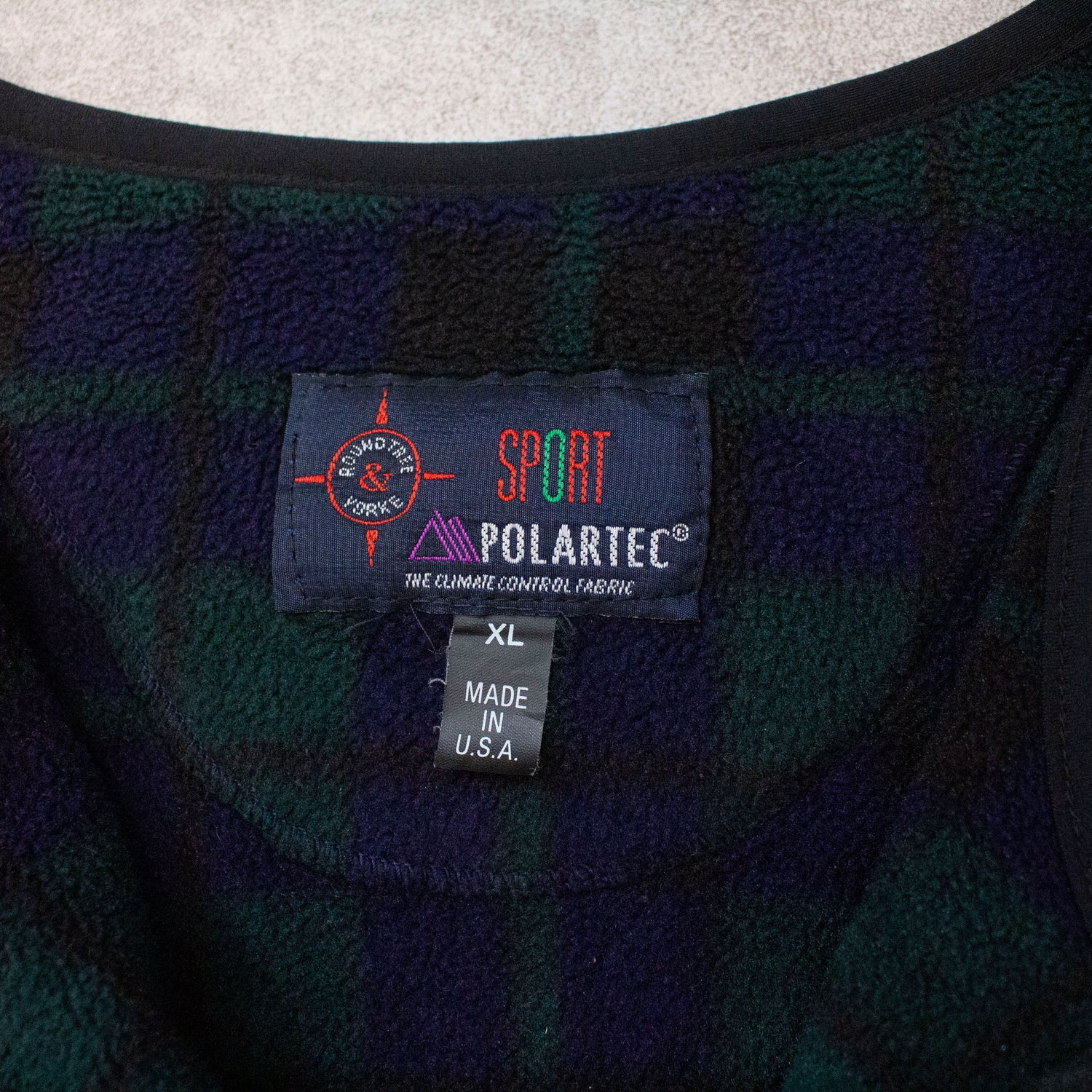 グッドなレギュラー古着でよく目にするブランドRoundtree&Yorke。カジュアルな紳士服などやっているブランドです。ブラックウォッチのフリースってだけで中々でないのですがですがクルーネックってのがさらに珍しいですね。Vネックのものとは全然印象変わりますね。全体的に丸っこい作りなので肩馴染みがよく女性が着ても可愛く着用できます。ここら辺のフリースベストは家の中でも外でも着れるので一枚あると便利です。身幅は広めなのでスウェットの上からでも着れますよ。ポーラテックフリースっていうのもテンション上がりますがUSA製なのも嬉しいポイントです。これぞグッドレギュラー。