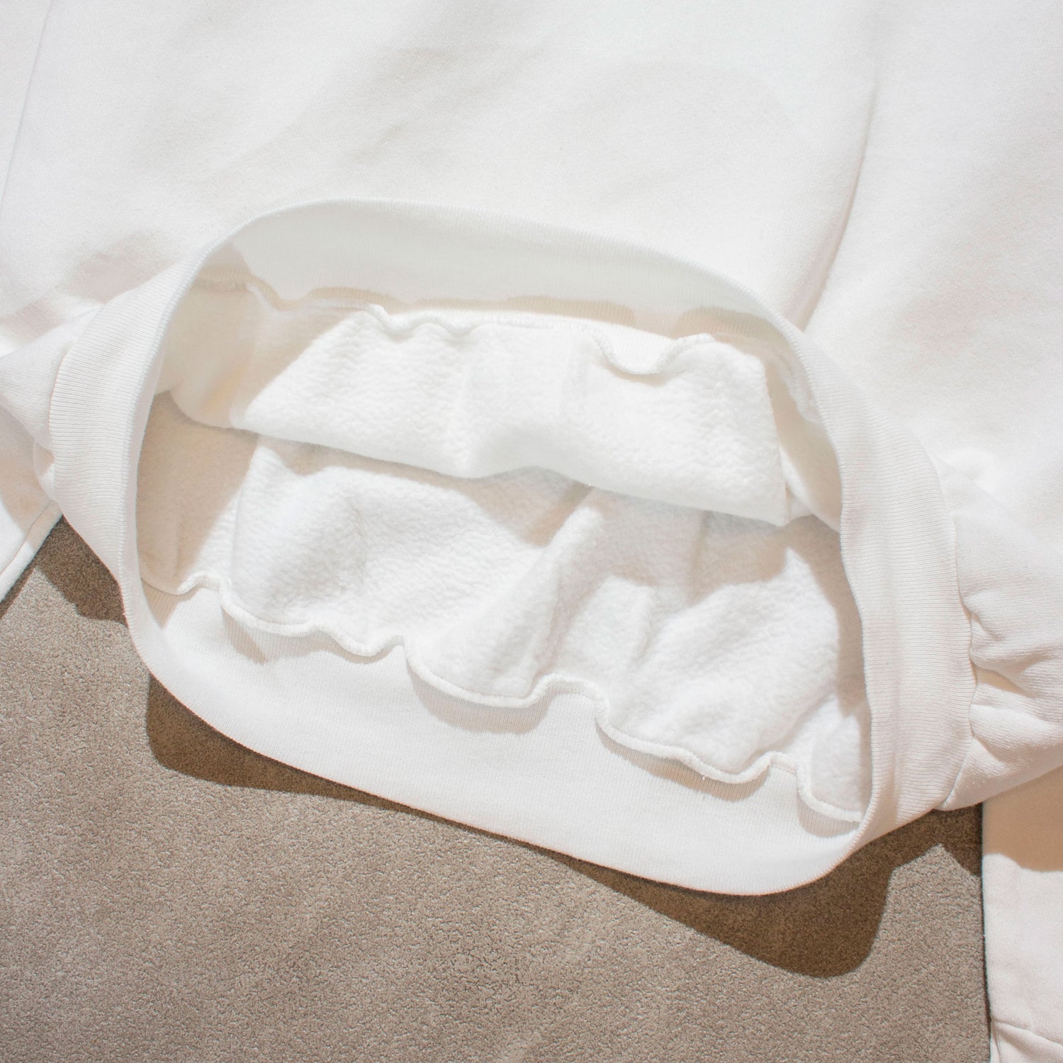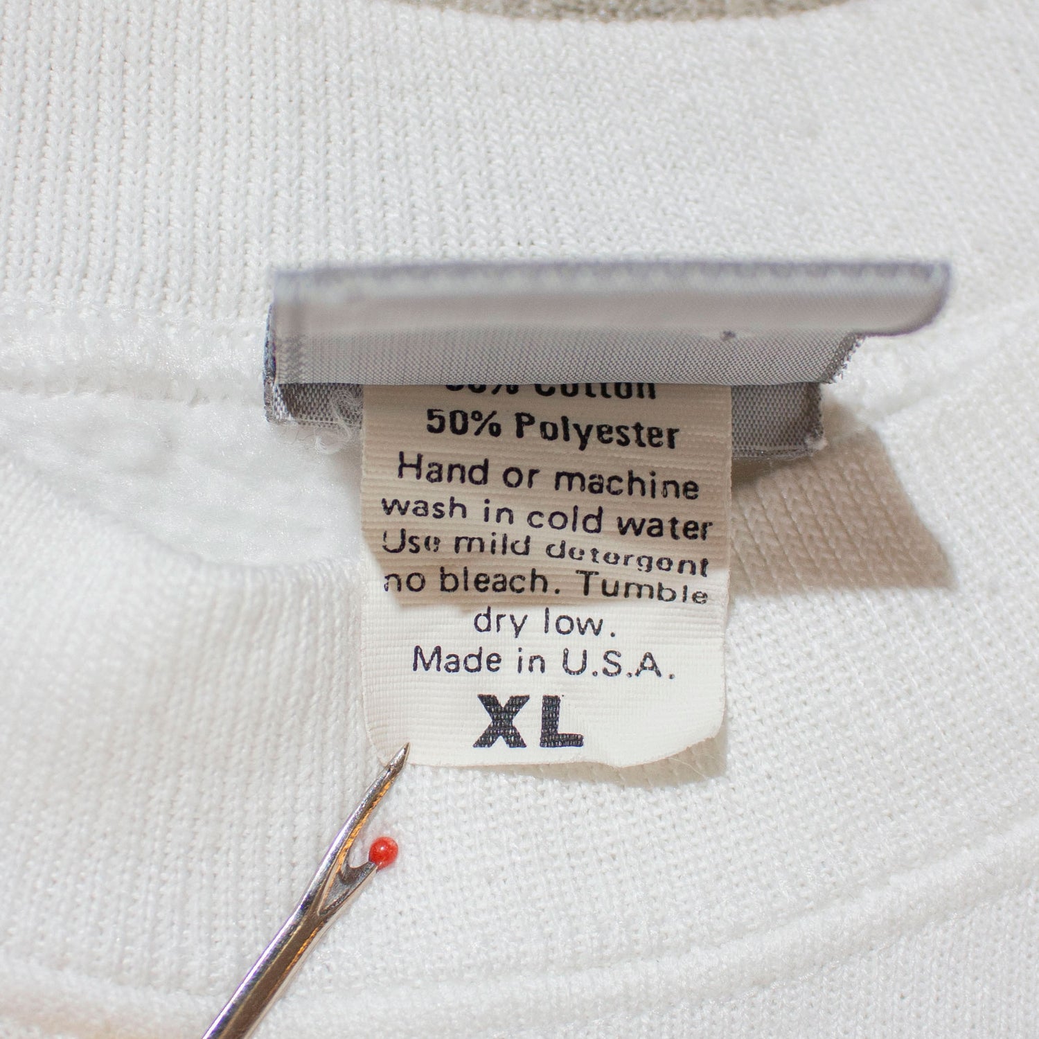1988年のコピーライト表記が入っており、年代としてもそのあたりで見て問題なさそうです。この時代らしいサイケなグリーンのプリントが、ホワイトボディによく映えるデザイン。身幅はゆったりめで、176cm着用でやや余裕のあるサイズ感でした。寒い時期のインナーに白スウェットを差す感じも洒落ていて、スタイリングのアクセントとしても使いやすい1枚です。